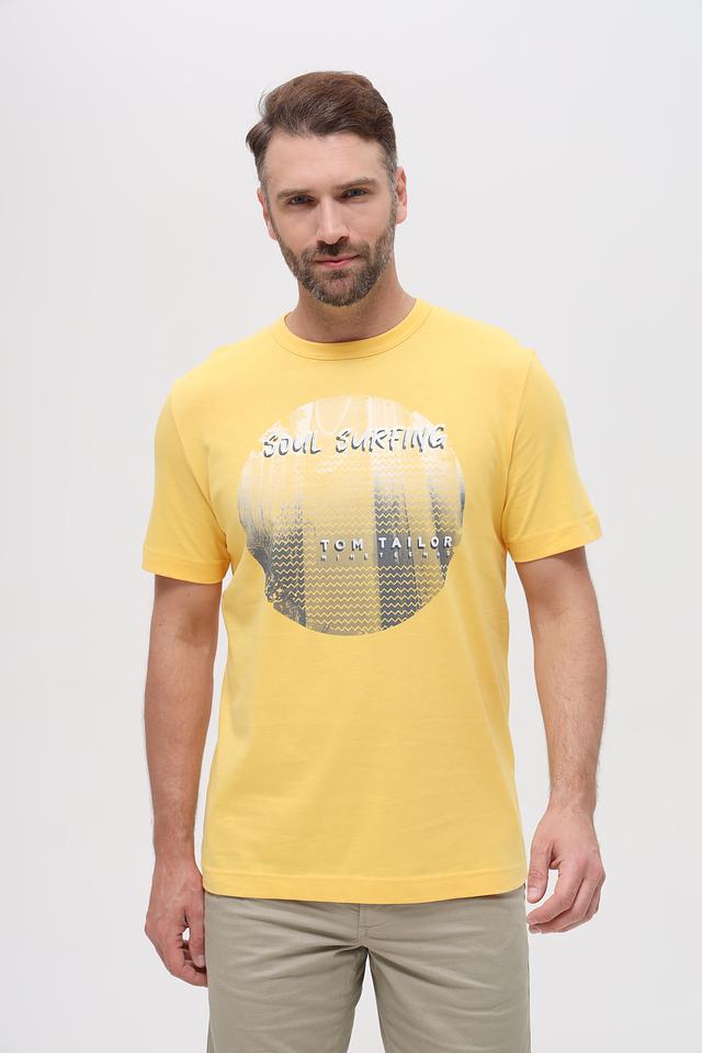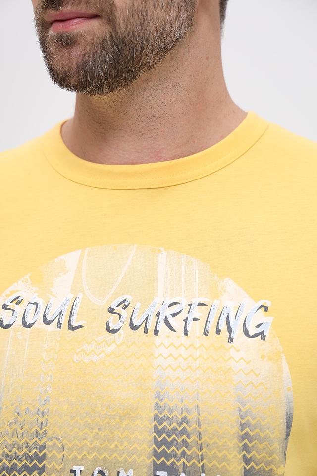 Эта стильная футболка от Tom Tailor выполнена в ярком жёлтом цвете и украшена эффектным принтом "Soul Surfing". Дизайн с изображением волн и надписью бренда придаёт ей динамичный и современный вид.