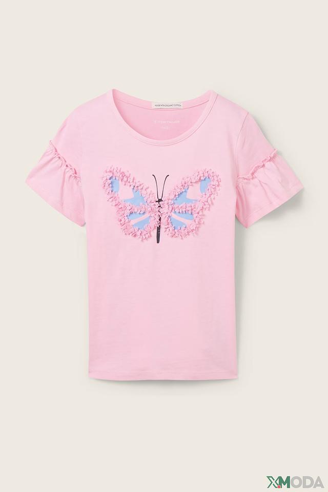 Розовая футболка Tom Tailor для девочки с ярким принтом бабочки. Модель выполнена из мягкого хлопка и дополнена милыми оборками на рукавах, что придает ей очаровательный вид. Состав: хлопок 100%