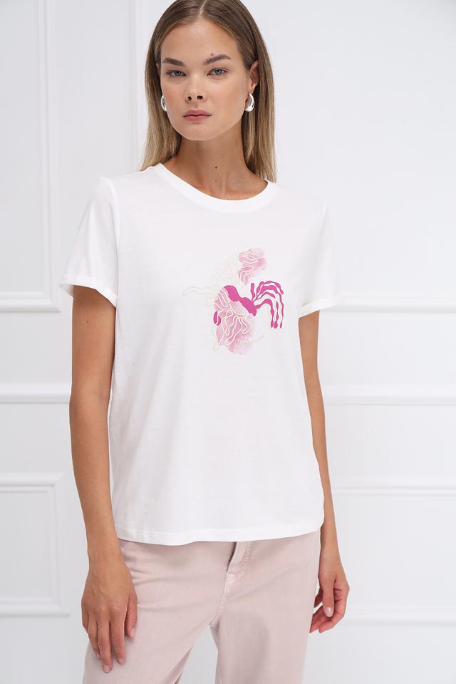 Особенностью данной модели является яркий и стильный цветочный принт в розовых тонах, который добавляет образу женственности и индивидуальности. Футболка имеет классический прямой крой и короткие рукава, что делает ее идеальной для теплой погоды.