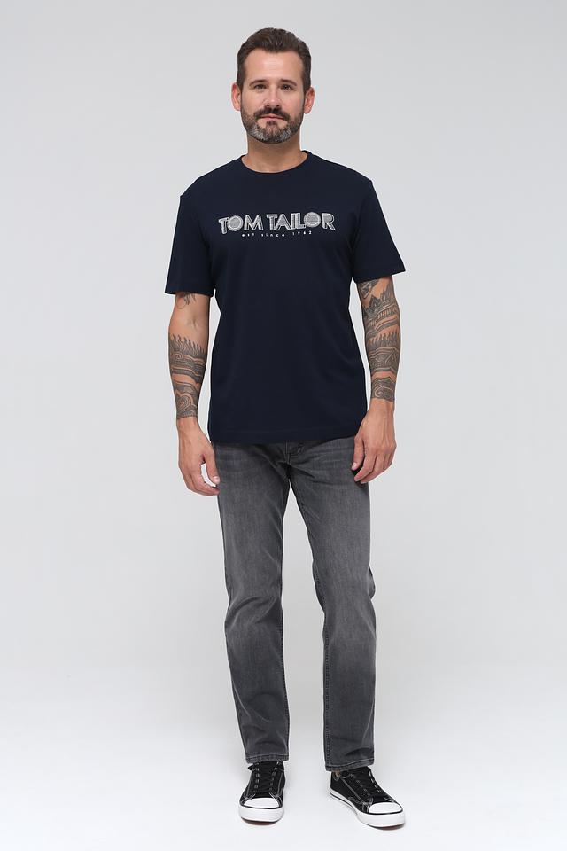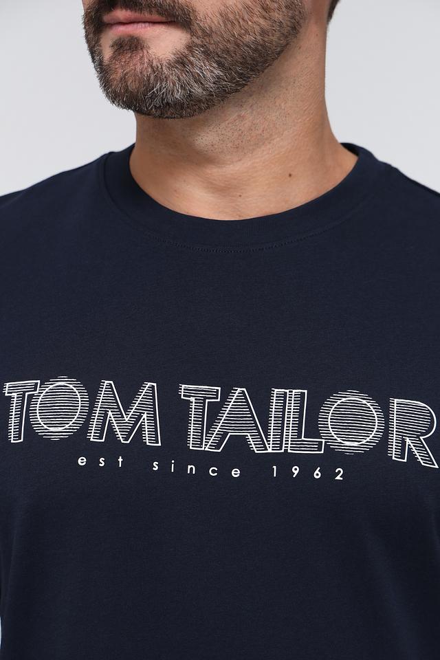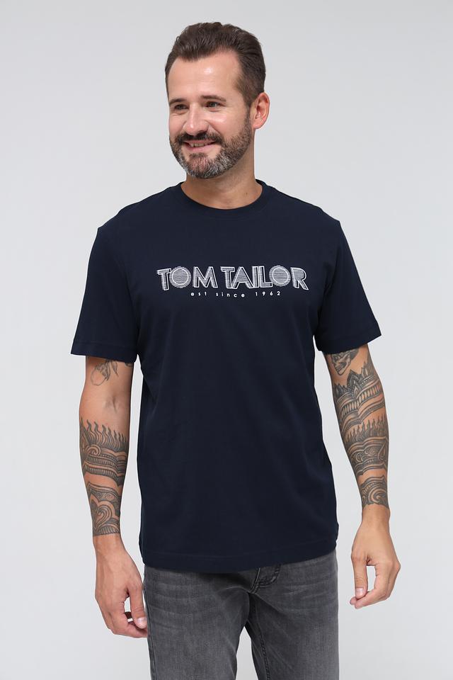 Футболка имеет прямой крой, короткие рукава и классический круглый вырез горловины. На груди расположен логотип бренда Tom Tailor, выполненный в белом цвете, что добавляет модели узнаваемости.