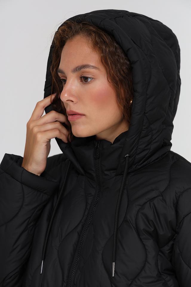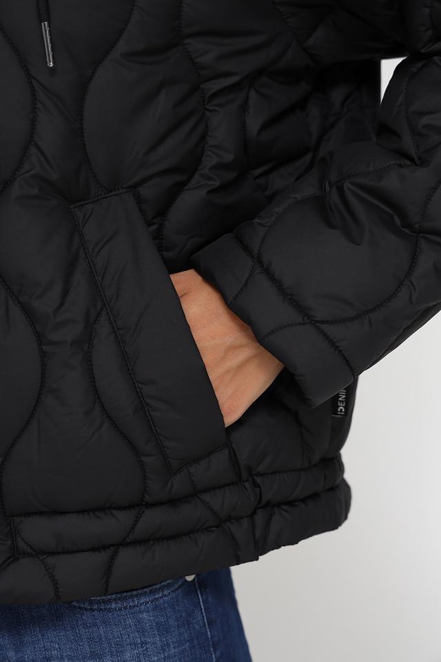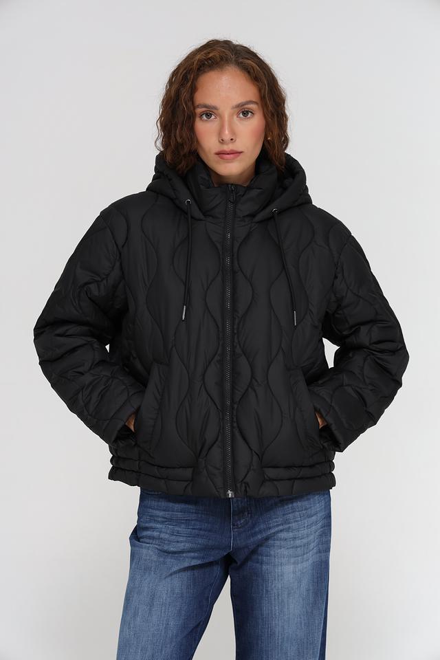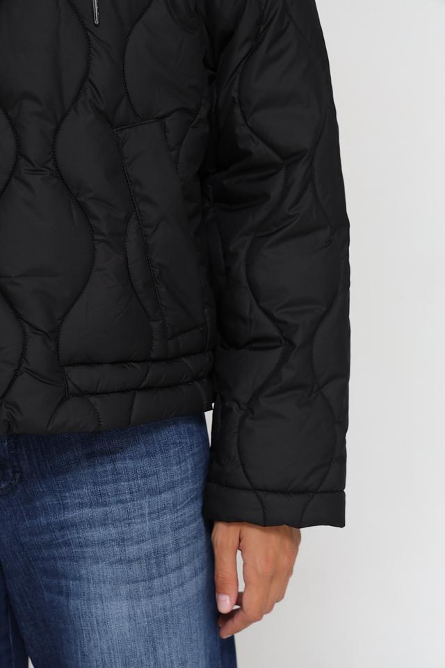 Куртка имеет стёганую текстуру, которая придает ей современный вид. Капюшон с регулируемыми шнурками обеспечивает дополнительную защиту от ветра и непогоды. Застежка-молния позволяет быстро и удобно надевать и снимать куртку.