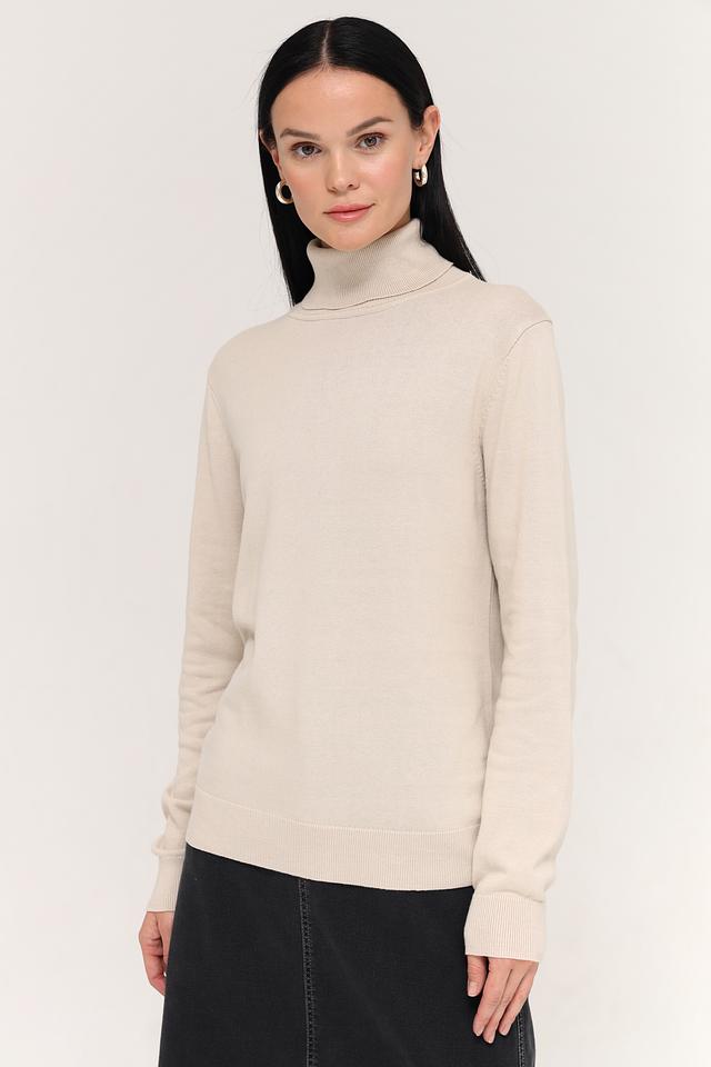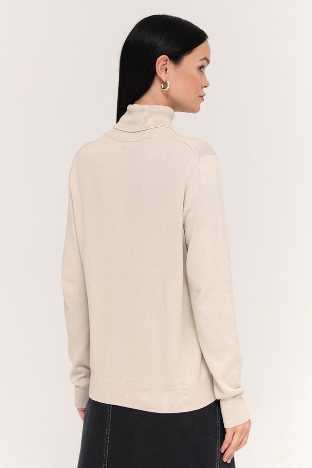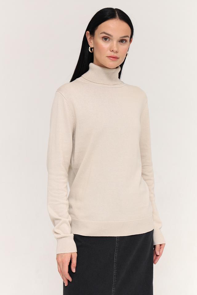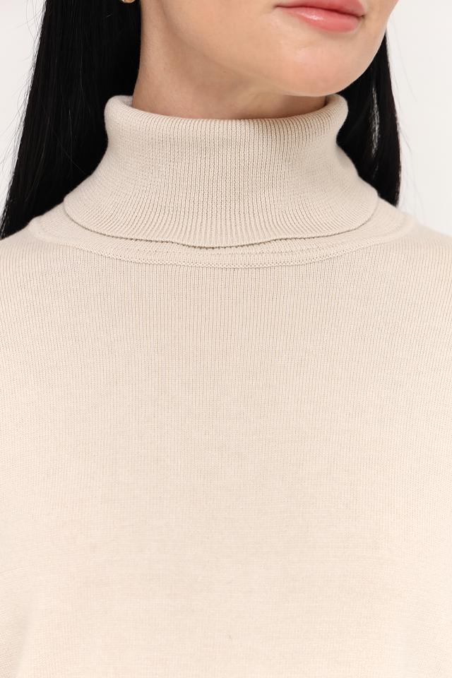 Модель имеет классический крой с высоким воротом, который визуально удлиняет шею и придает образу элегантность. Водолазка выполнена из приятного на ощупь материала, сочетающего в себе 60% хлопка и 40% вискозы, что обеспечивает комфорт и хорошую посадку по фигуре.