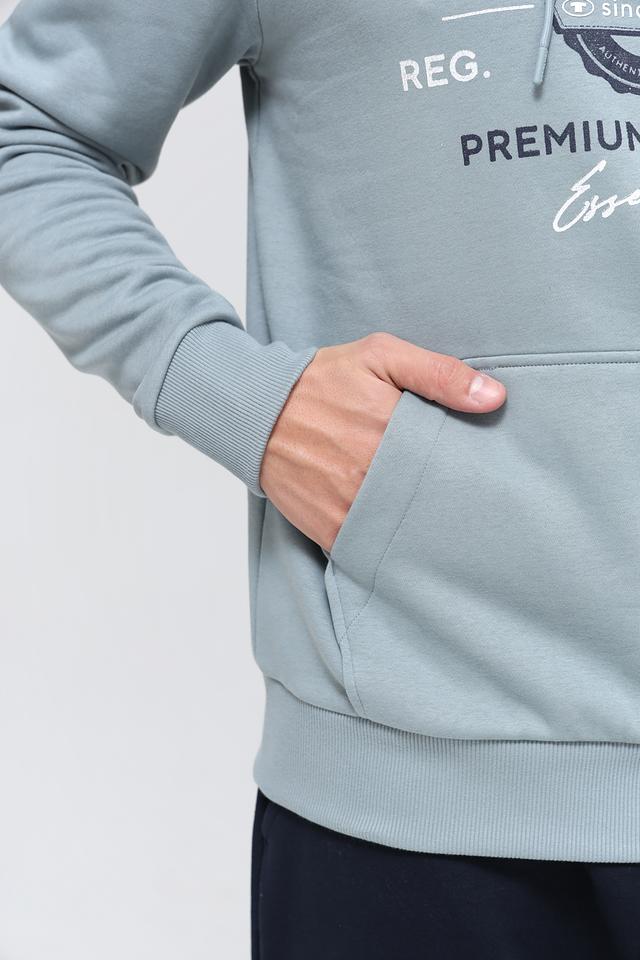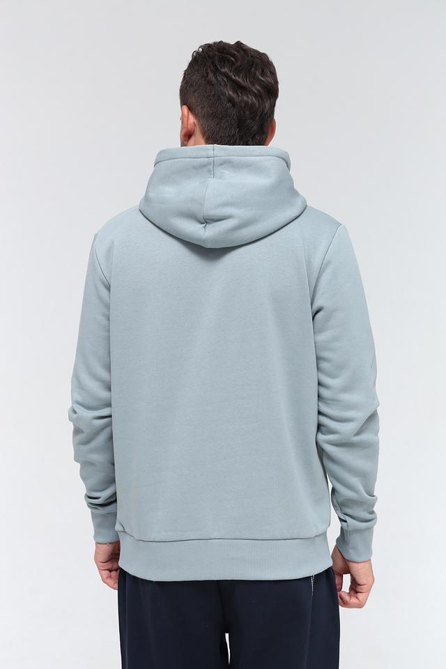 Толстовка имеет классический крой с капюшоном и карманом-кенгуру. Голубой цвет изделия дополнен контрастным принтом с логотипом бренда и надписями, что придает ей современный и стильный вид.