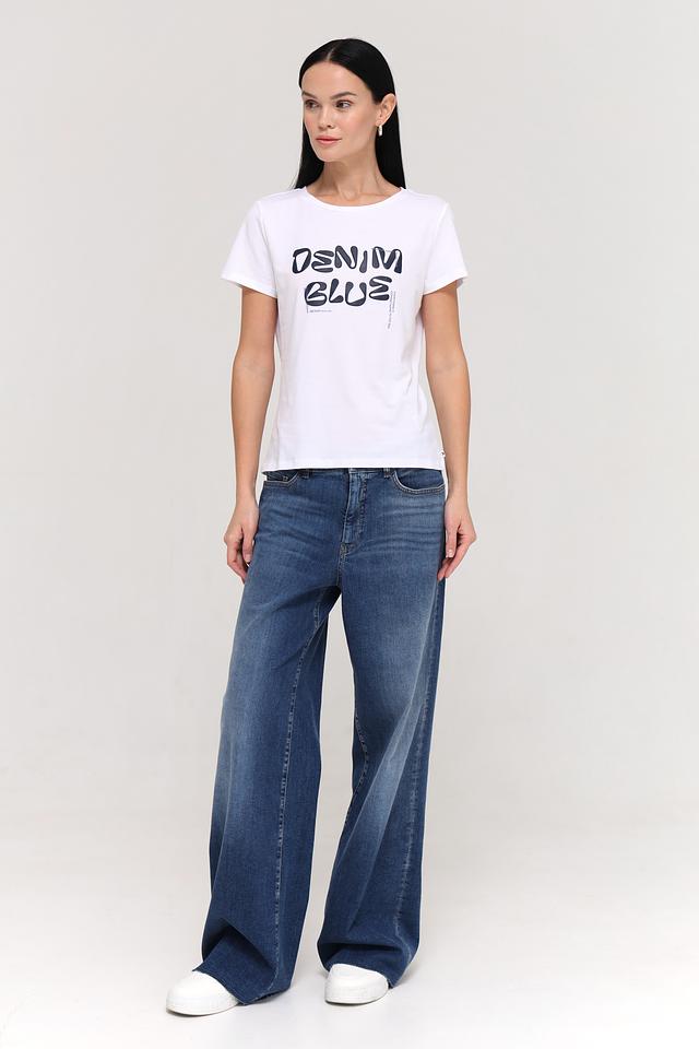 Футболка имеет прямой крой и короткие рукава, что делает ее идеальной для повседневной носки в теплую погоду. Особенностью модели является яркий принт "DENIM BLUE" на лицевой стороне, выполненный в синих и белых тонах.