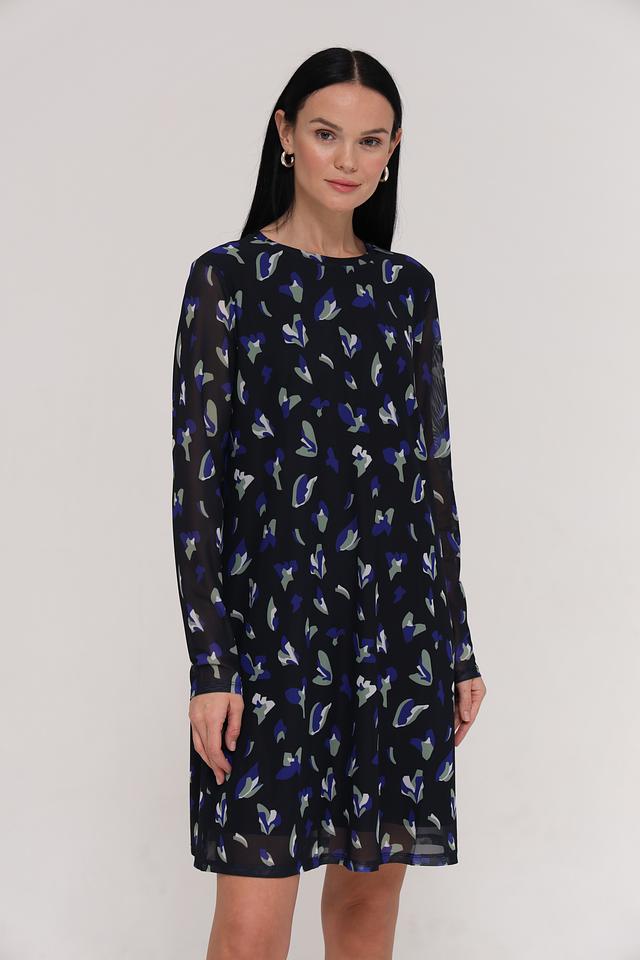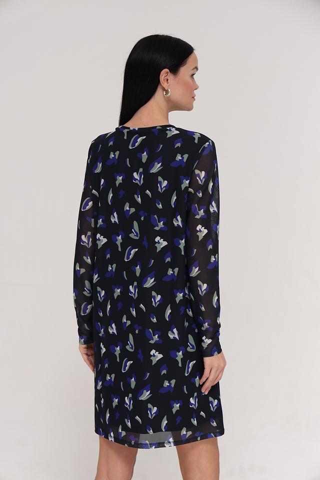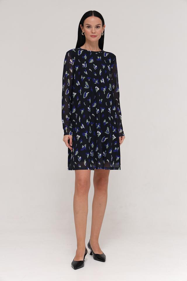 Платье имеет длинные рукава и свободный крой, что делает его удобным для повседневной носки. Вырез горловины круглый, что придает образу мягкость и женственность. Длина платья – до колена, что делает его универсальным для различных случаев.