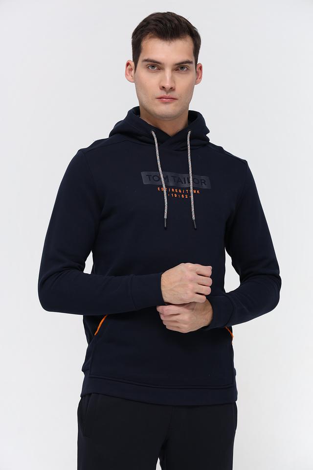 На груди расположена фирменная надпись Tom Tailor, выполненная в контрастном цвете, что придает толстовке стильный и узнаваемый вид. Небольшая оранжевая вставка на кармане добавляет акцент. Толстовка изготовлена из высококачественного 100% хлопка, что обеспечивает мягкость, приятные тактильные ощущения и долговечность изделия.