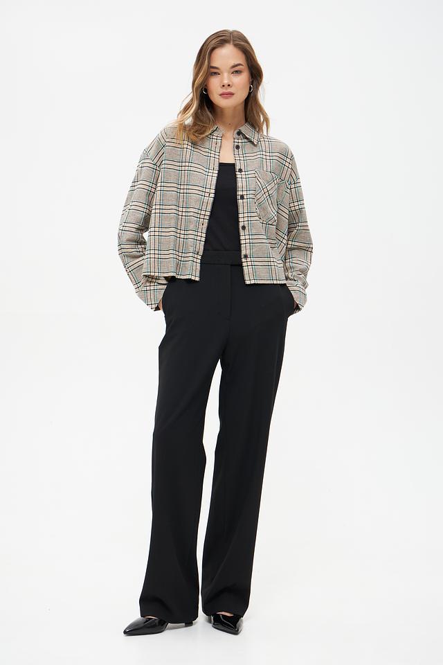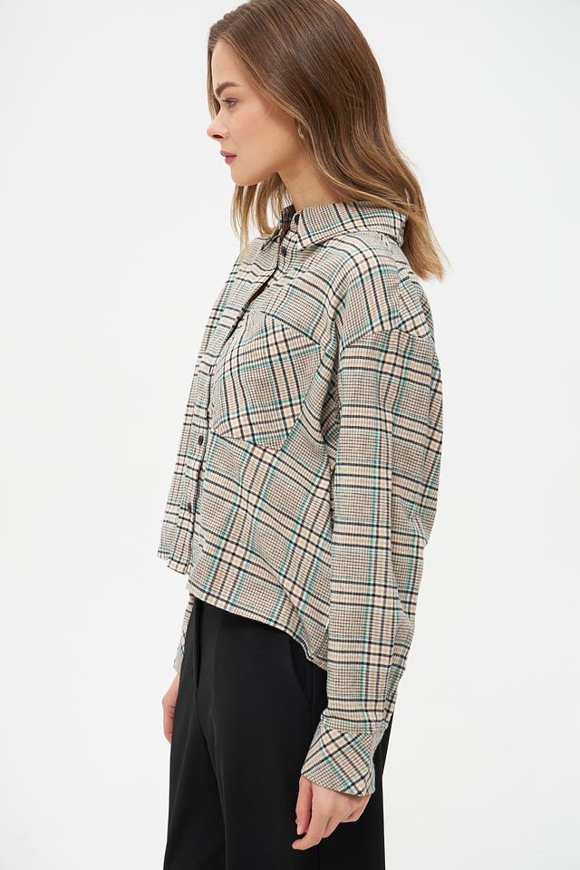 Жакет имеет рубашечный крой с отложным воротником и застежкой на пуговицы. На груди расположен накладной карман с клапаном, также выполненный в клетку. Длинные рукава дополняют образ.