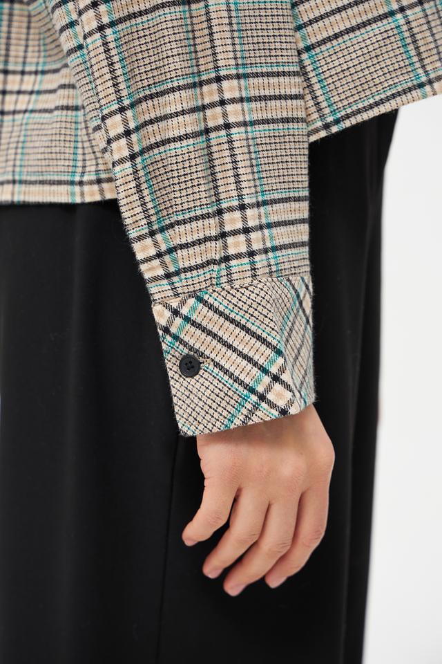 Этот жакет от Tom Tailor выполнен в классическом стиле с укороченным кроем. Преобладающий цвет – бежевый, с характерным клетчатым принтом, включающим в себя оттенки голубого, коричневого и белого.
