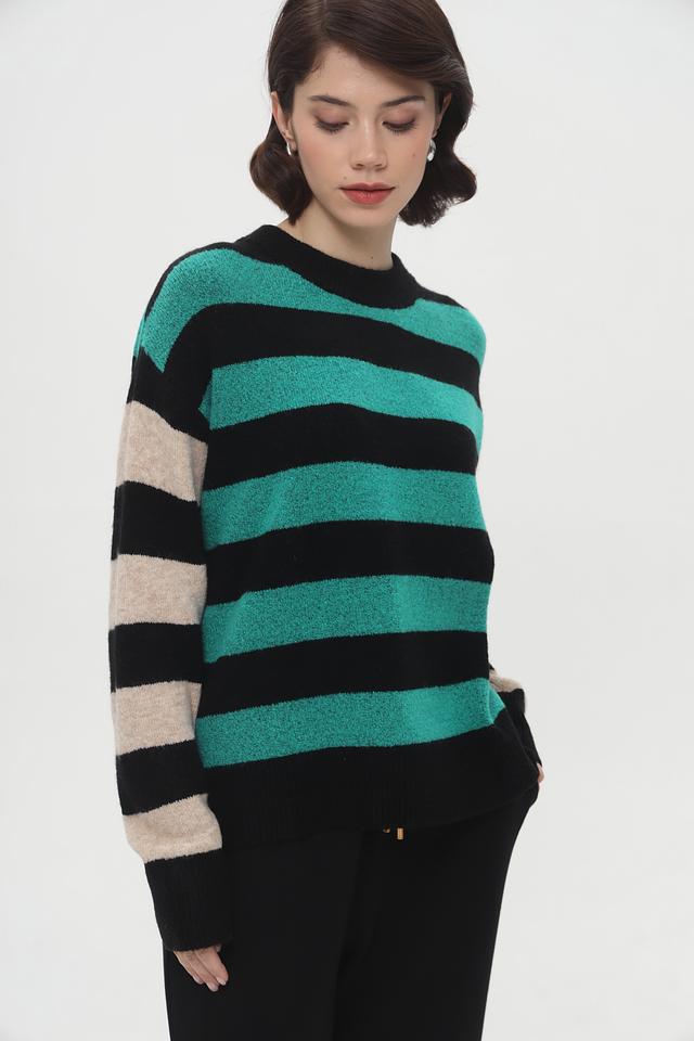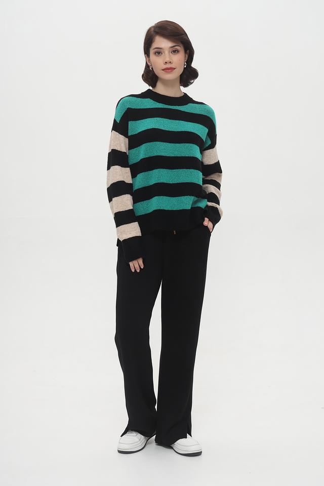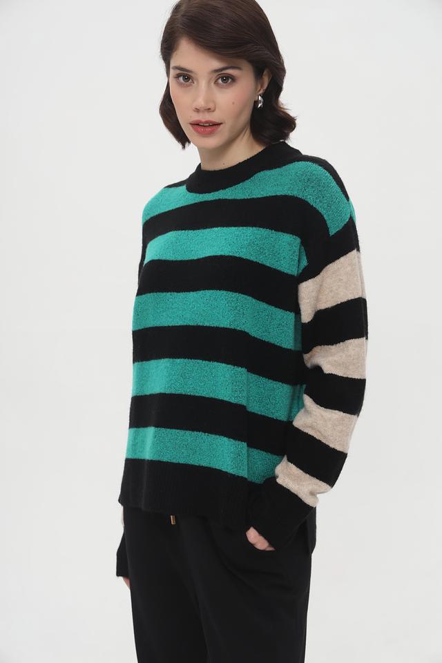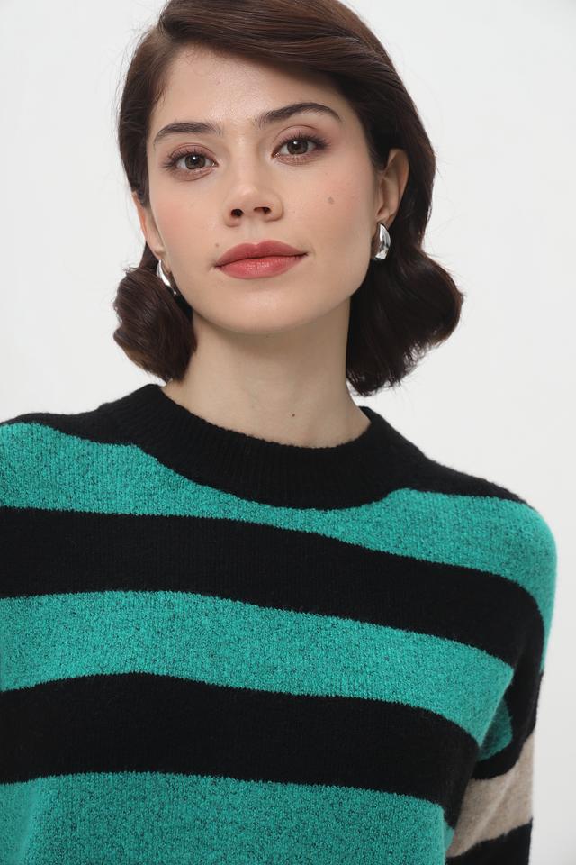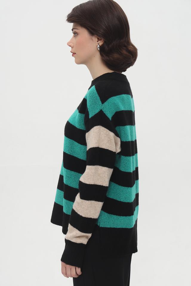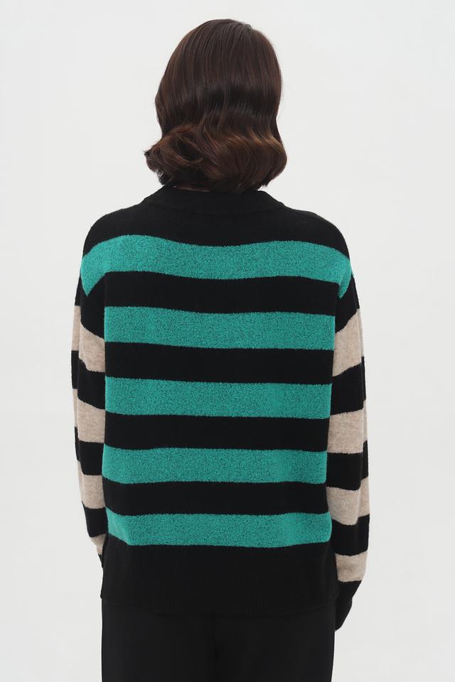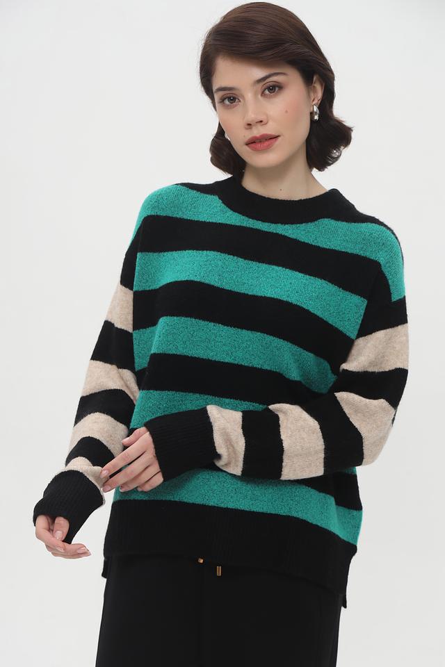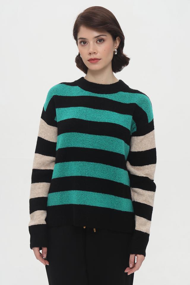 Женский пуловер Tom Tailor бирюзового и чёрного цвета с ярким полосатым дизайном. Модель выполнена из мягкого трикотажа с добавлением хлопка и эластана для комфорта и хорошей посадки. Состав: полиакрил 62%, полиэстер 25%, хлопок 10%, эластан 3%