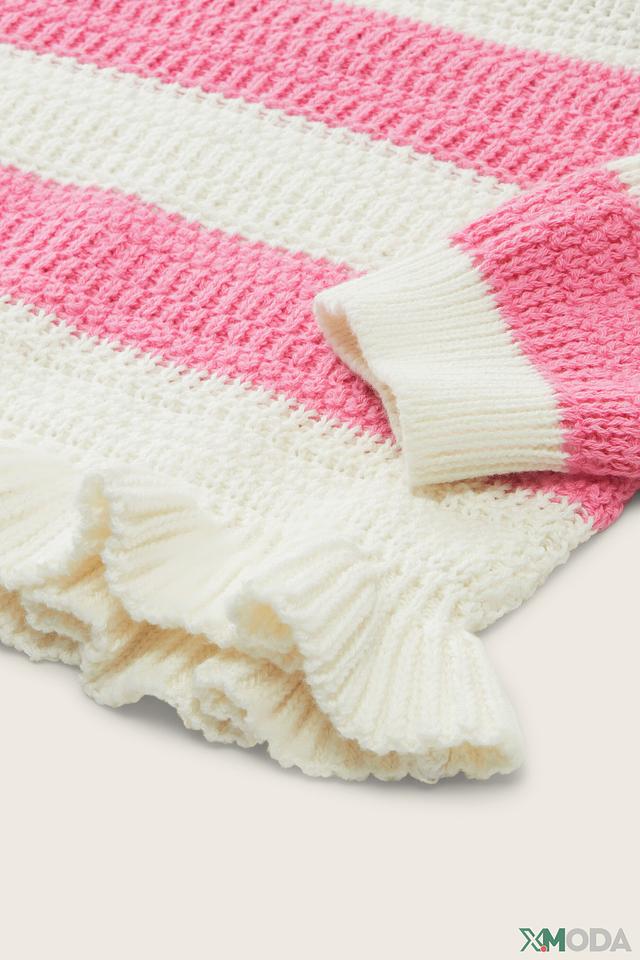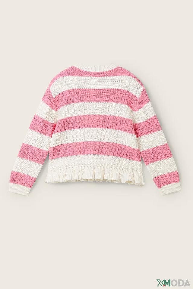 Дизайн пуловера выполнен в классической бело-розовой полоске, которая придает ему свежий и игривый вид. Округлый вырез горловины и длинные рукава обеспечивают удобную посадку. Особенностью модели является деликатный ворсистый край по низу изделия, добавляющий ему нежности и оригинальности.