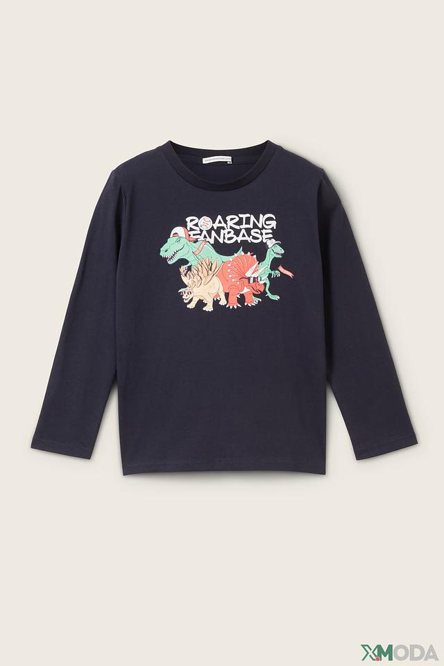 Синяя футболка Tom Tailor с длинным рукавом для мальчиков, украшенная ярким принтом с изображением динозавров. Изготовлена из 100% хлопка, обеспечивая комфорт и удобство в носке. Состав: хлопок 100%