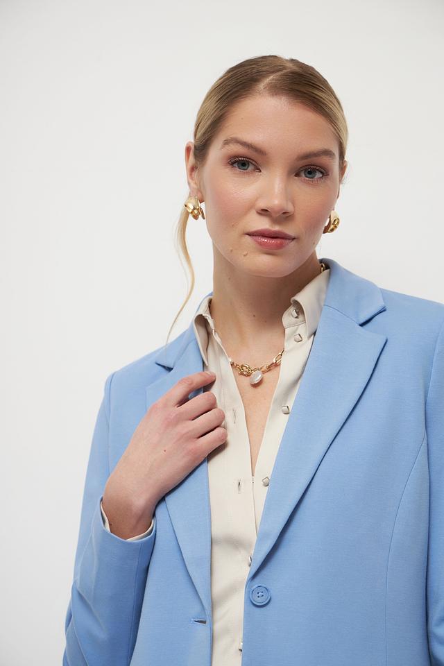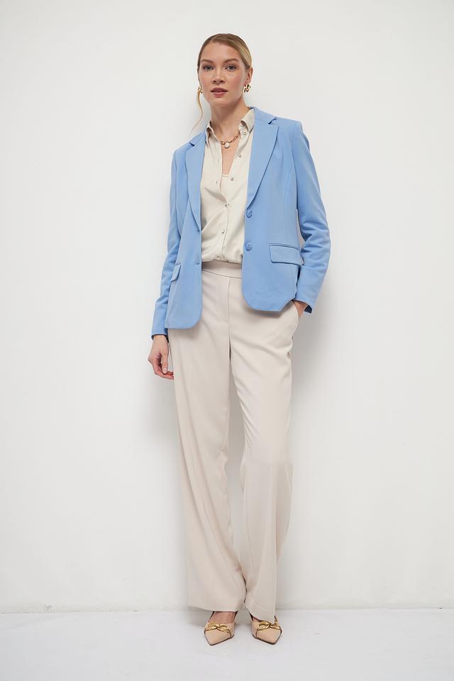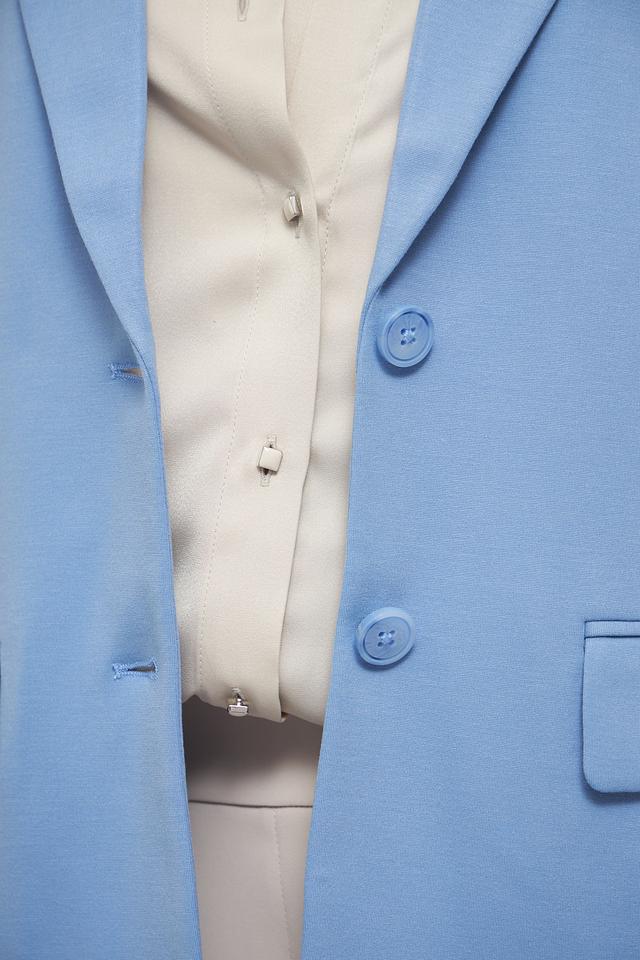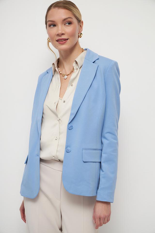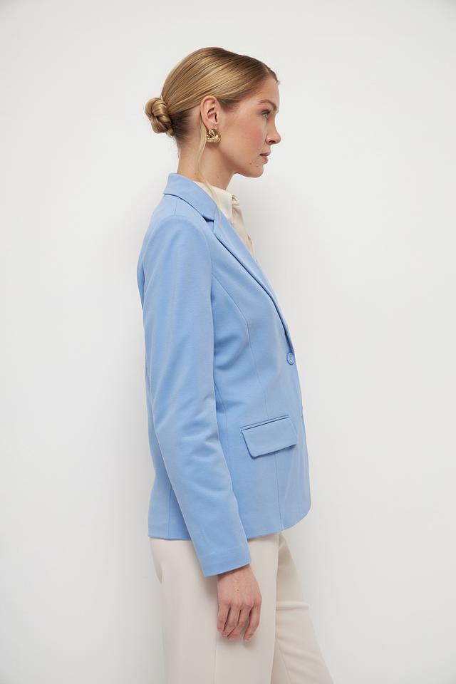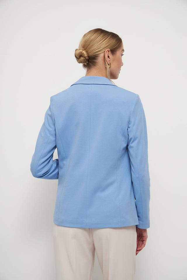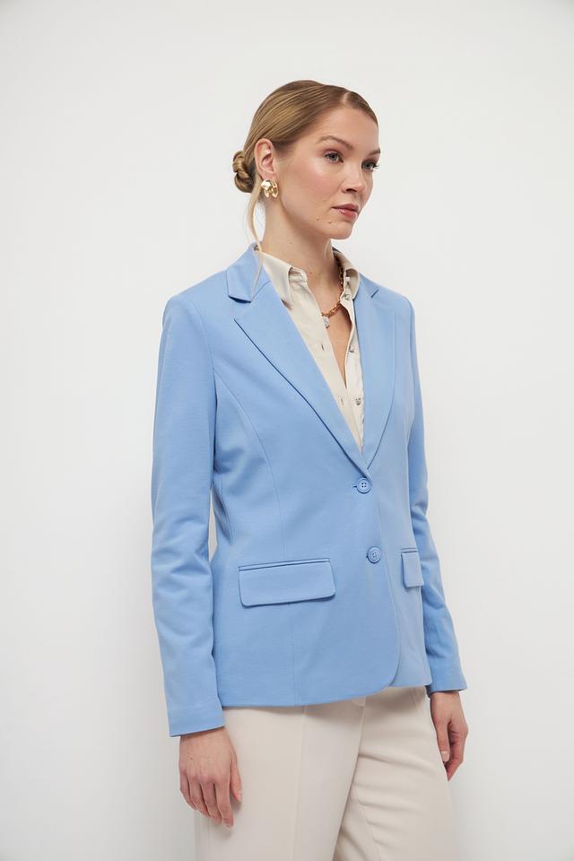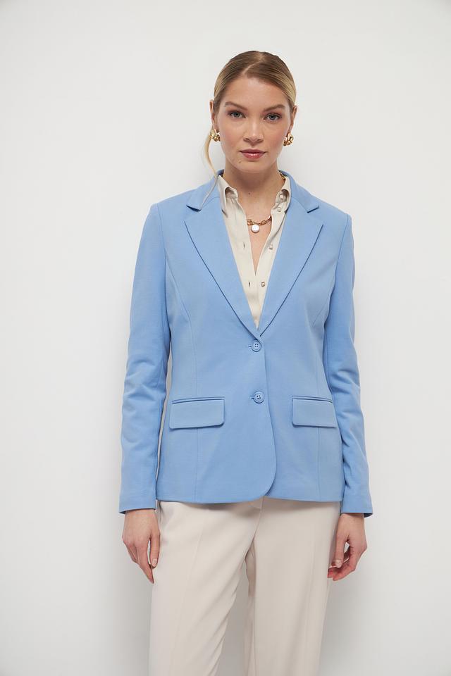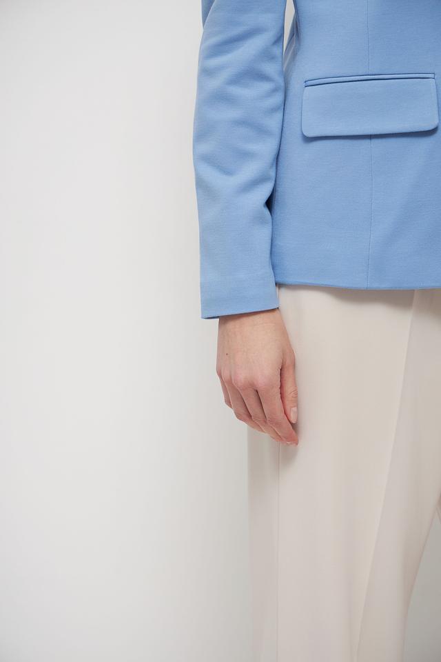 Жакет выполнен в нежном голубом цвете, который освежает образ и придает ему легкость. Застежка на пуговицы обеспечивает надежную фиксацию. Два функциональных кармана добавляют практичности.