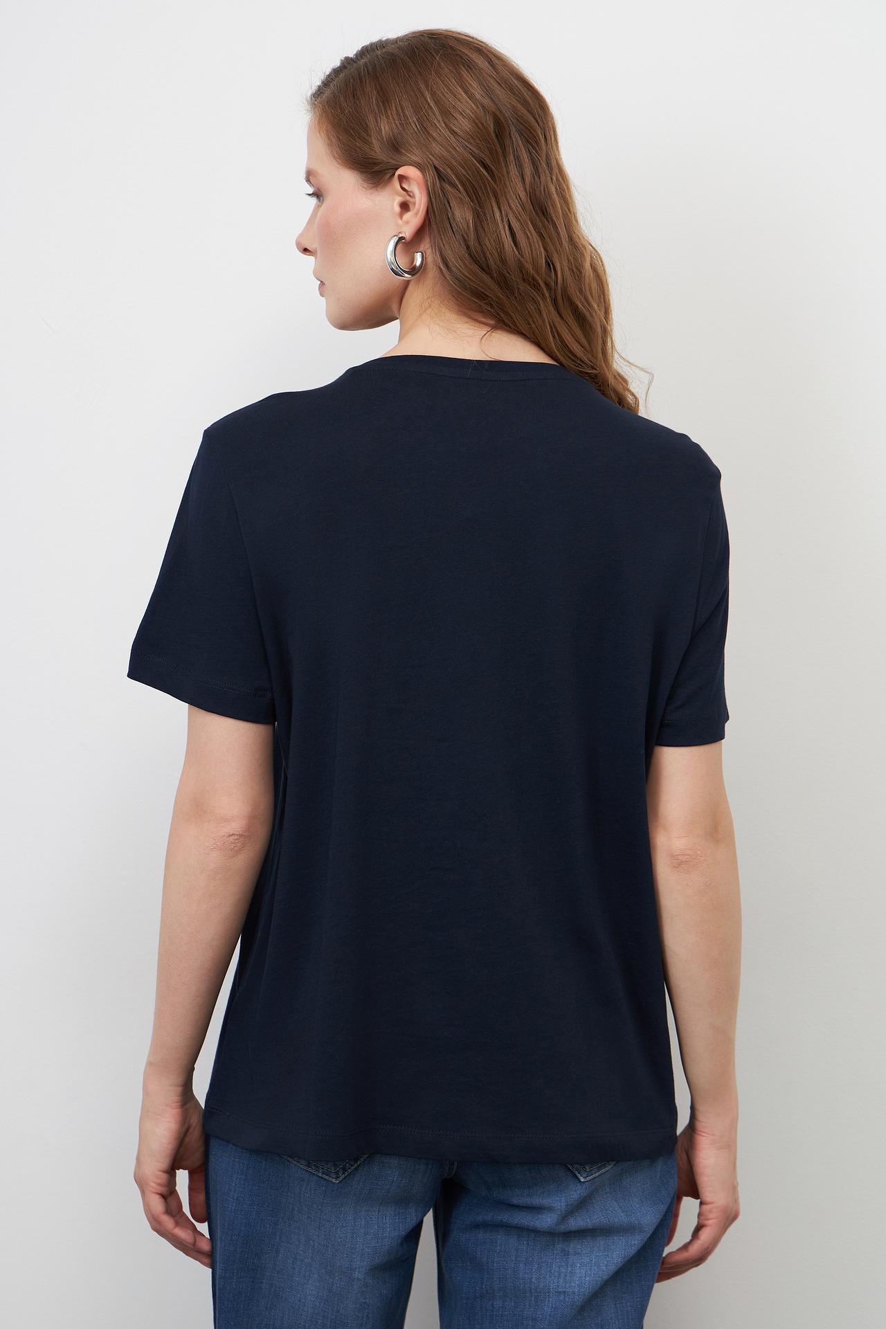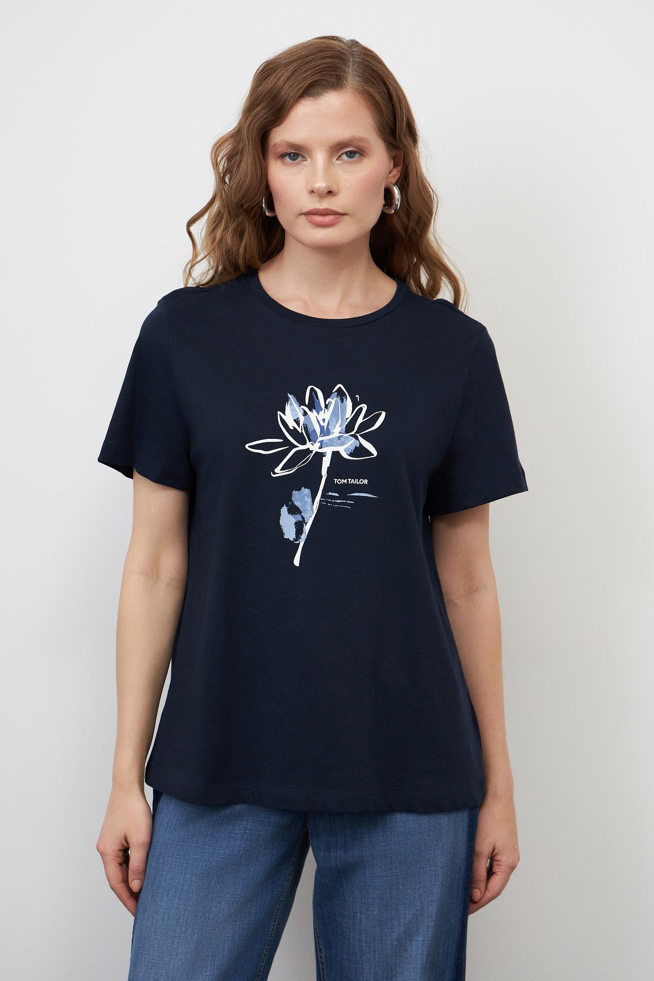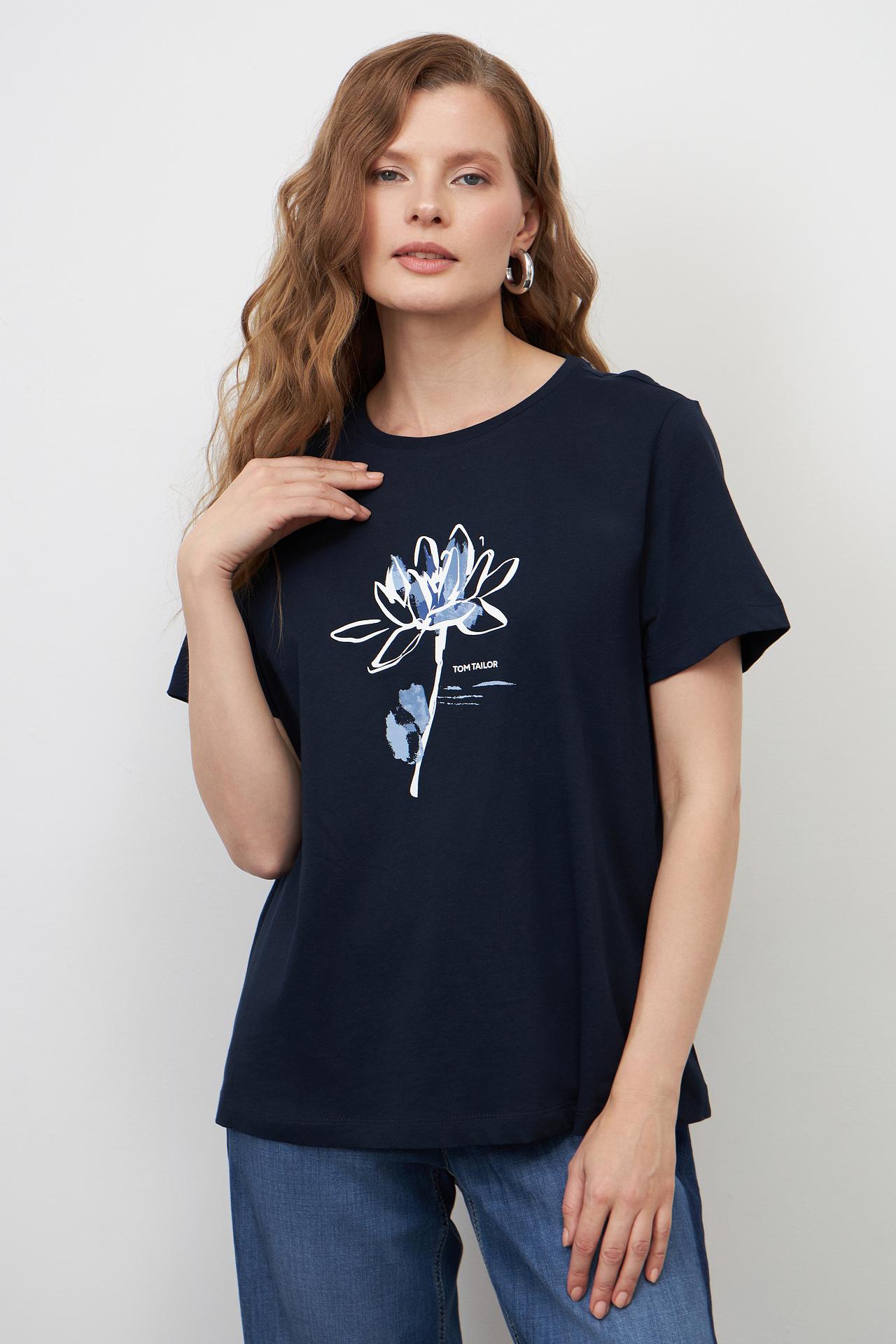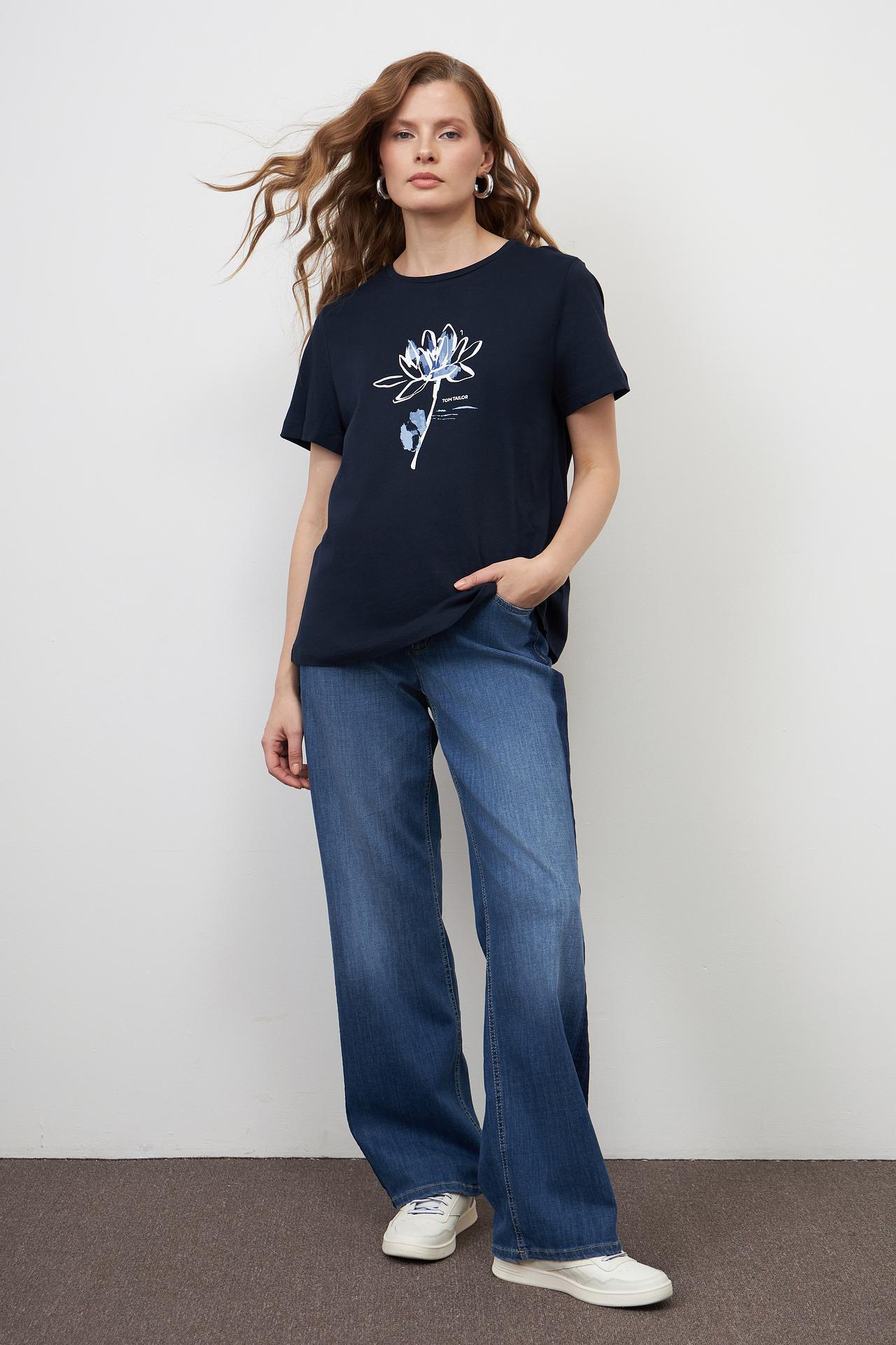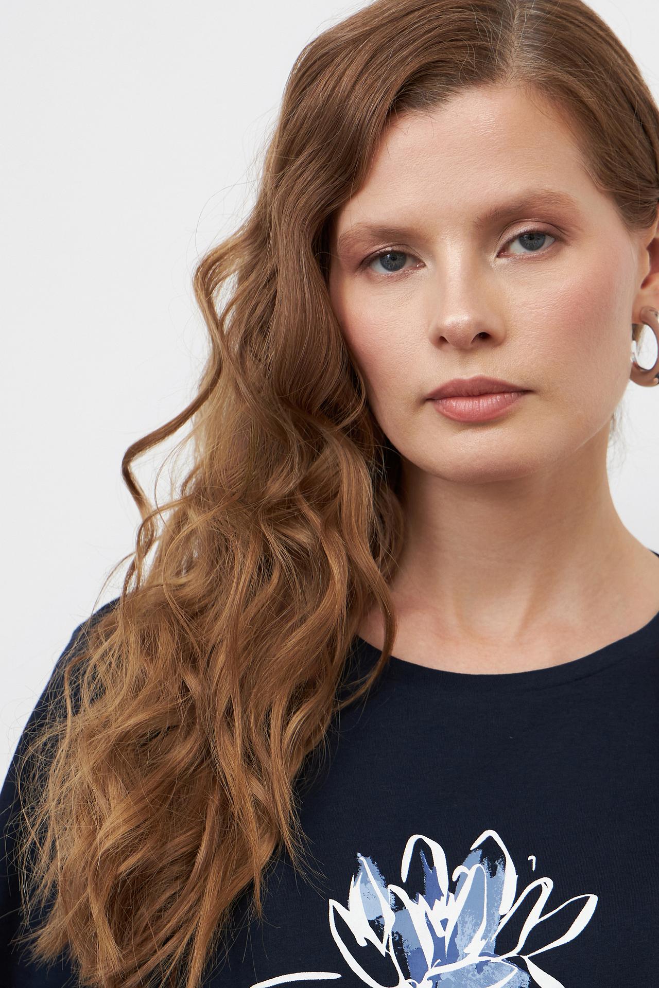 Дизайн футболки выполнен в универсальном тёмно-синем цвете, который дополнен изящным акварельным принтом в виде цветка. Классический прямой крой обеспечивает идеальную посадку по фигуре, не сковывая движений, а круглый вырез горловины добавляет изделию аккуратный и завершенный вид. Эта модель подчеркивает вашу индивидуальность и добавляет свежести в любой образ.
