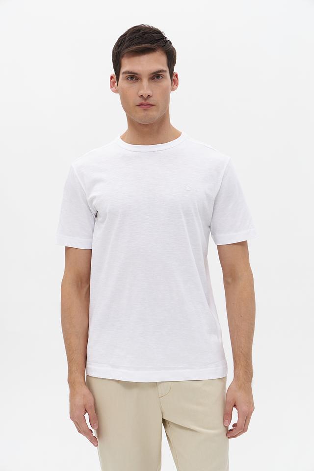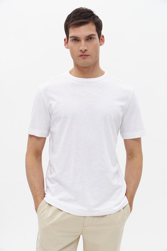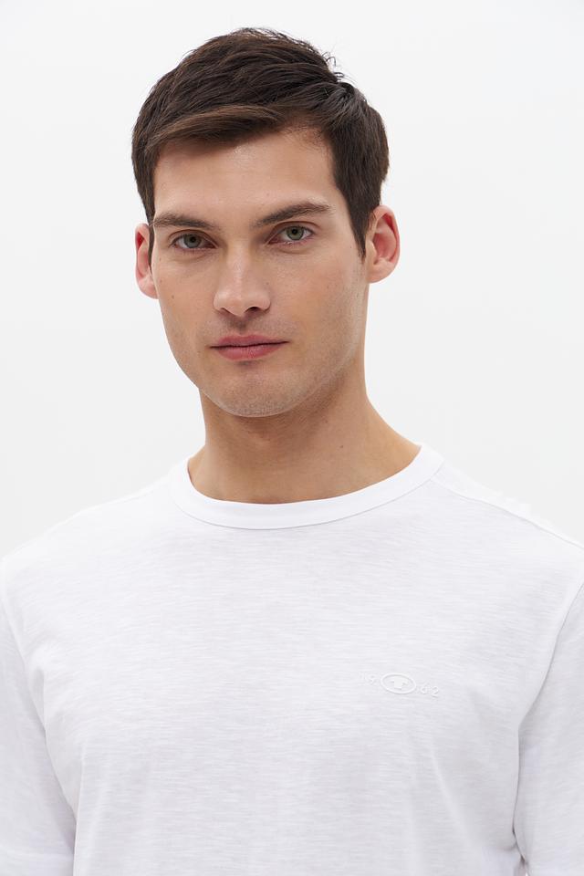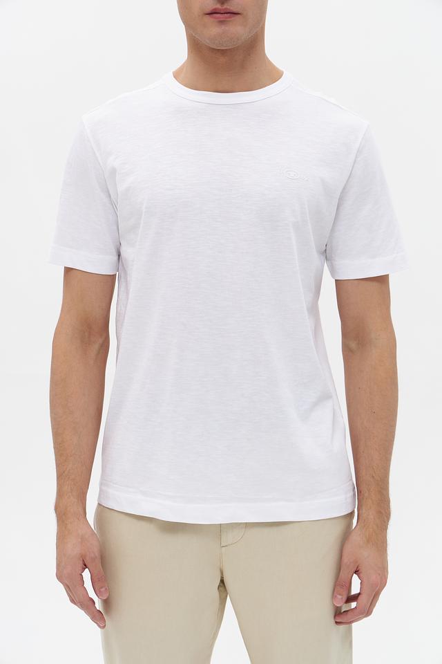 Футболка имеет круглый вырез горловины и короткие рукава. Минималистичный дизайн с небольшим логотипом бренда на груди делает ее универсальной для создания различных образов. Белый цвет легко сочетается с другими элементами гардероба.