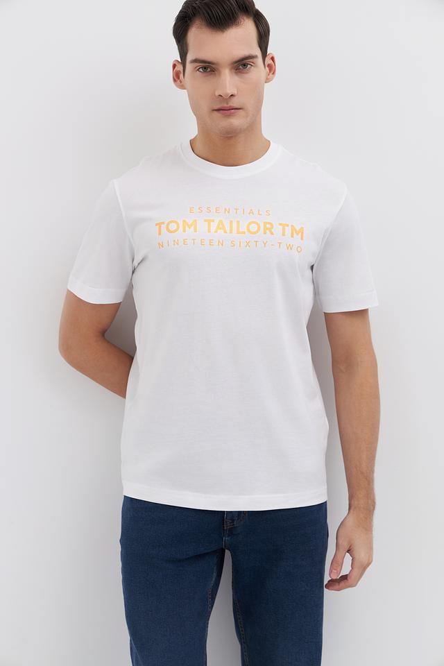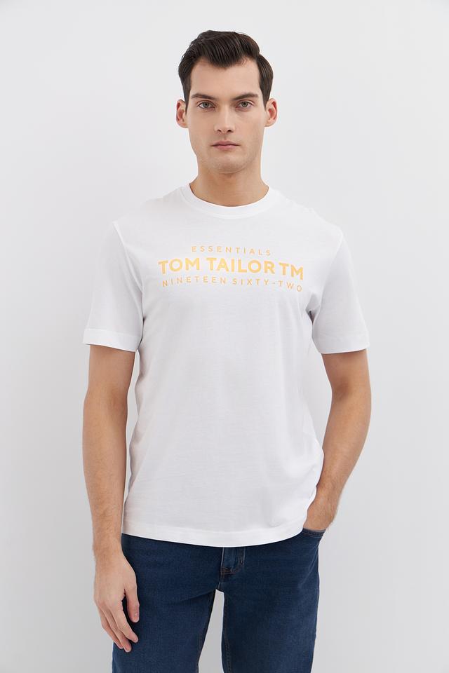 Белая футболка Tom Tailor из 100% хлопка с принтом Essentials. Классический крой и мягкий материал обеспечивают комфорт в повседневной носке. Состав: хлопок 100%