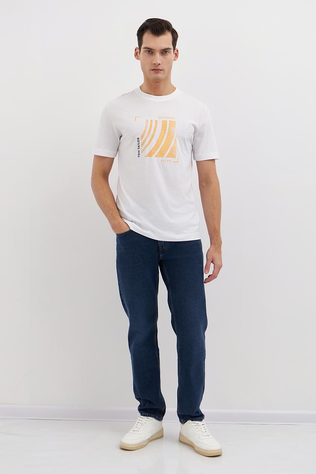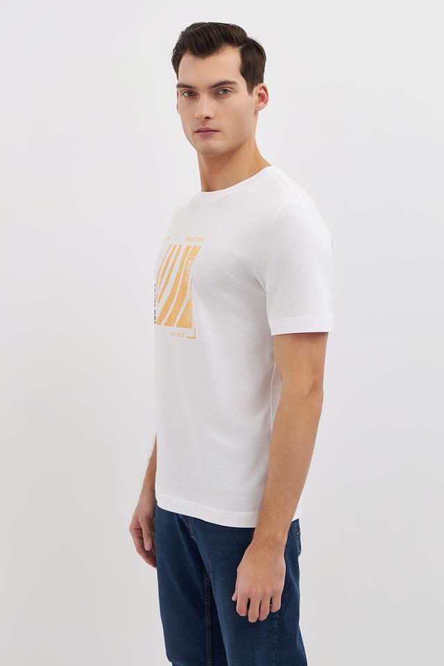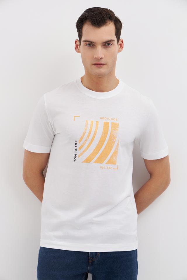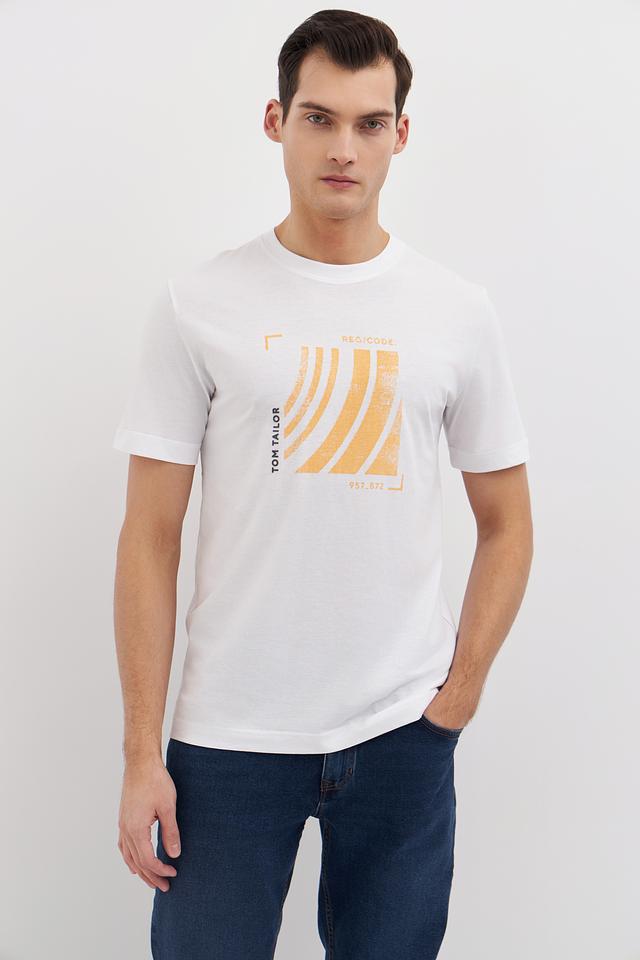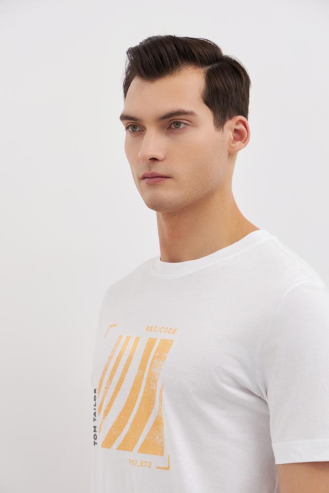 Белая футболка Tom Tailor с оригинальным графичным принтом в горчичных тонах. Изготовлена из 100% хлопка, обеспечивающего комфорт и воздухопроницаемость. Стильный и универсальный вариант для повседневного образа. Состав: хлопок 100%