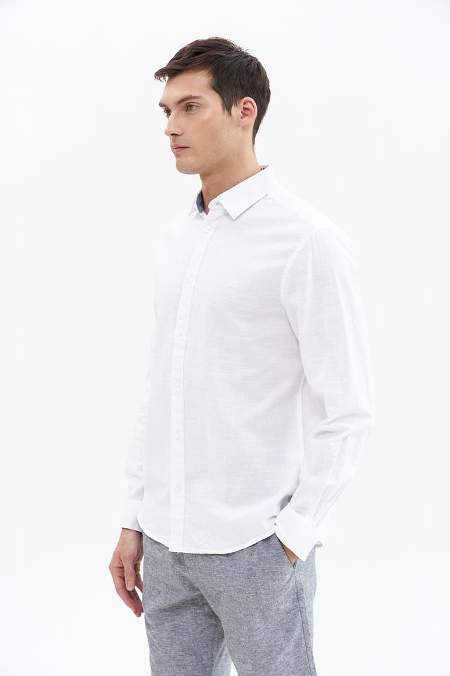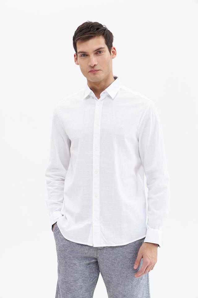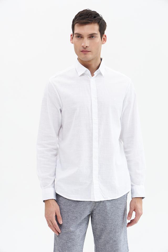 Рубашка имеет стандартную посадку, воротник классической формы и застёжку на пуговицы. Текстура ткани придает рубашке лёгкую небрежность и стильный вид. Белый цвет делает эту рубашку универсальной и легко сочетаемой с другими элементами одежды.