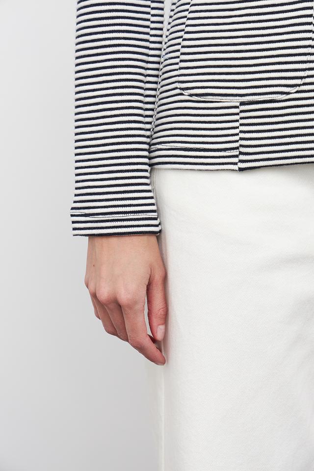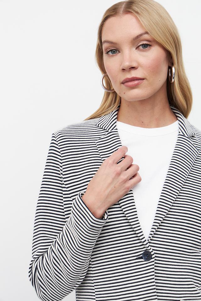 Жакет имеет полосатую расцветку – сочетание синего и белого цветов, что делает его универсальным и легко сочетаемым с различными элементами одежды. Застежка на пуговицах обеспечивает надежную фиксацию.