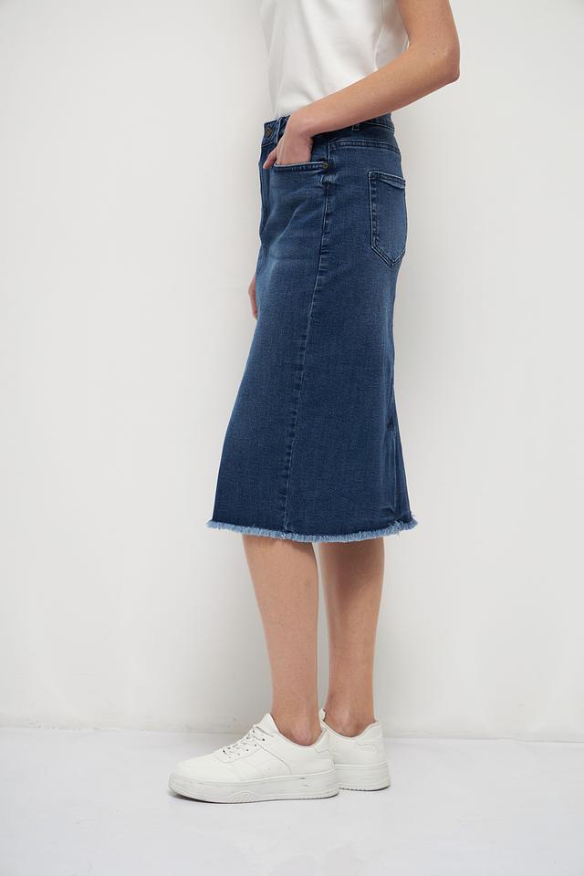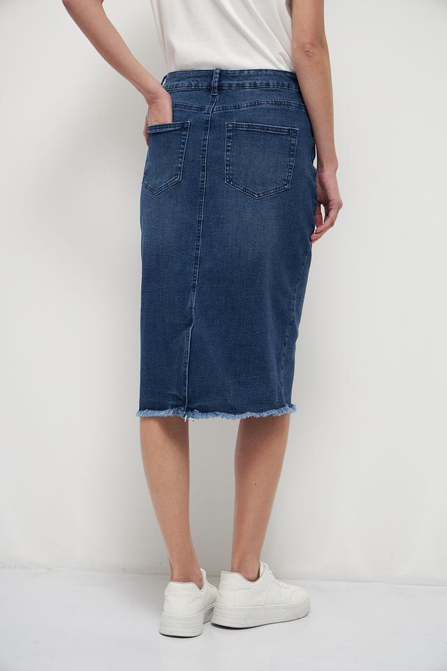 Модель имеет классический джинсовый крой с пятью карманами и необработанный край подола, что придает ей современный и слегка небрежный вид. Юбка идеально сочетается с футболками, топами и свитерами, а также с кедами, кроссовками или босоножками.