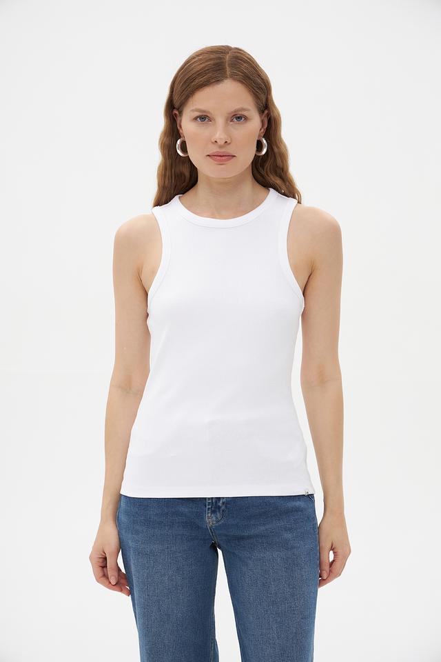 Топ имеет классический крой с округлым вырезом горловины и широкими бретелями. Благодаря минималистичному дизайну, он легко сочетается с различными элементами одежды – джинсами, юбками, шортами и брюками.