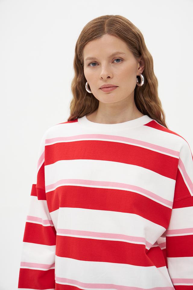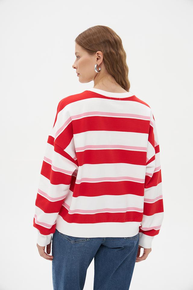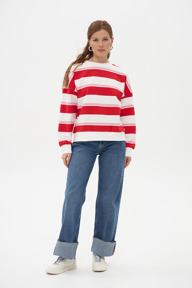 Женский пуловер Tom Tailor красного цвета с ярким полосатым дизайном. Изготовлен из мягкого хлопка, обеспечивающего комфорт в носке. Стильное и удобное решение для повседневного гардероба. Состав: хлопок 100%