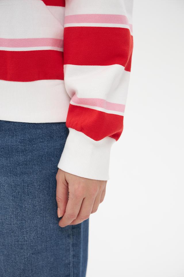Этот женский пуловер от Tom Tailor выполнен в яркой цветовой гамме с контрастными полосами. Преобладающие цвета – красный, белый и розовый, создающие динамичный и привлекательный образ.
