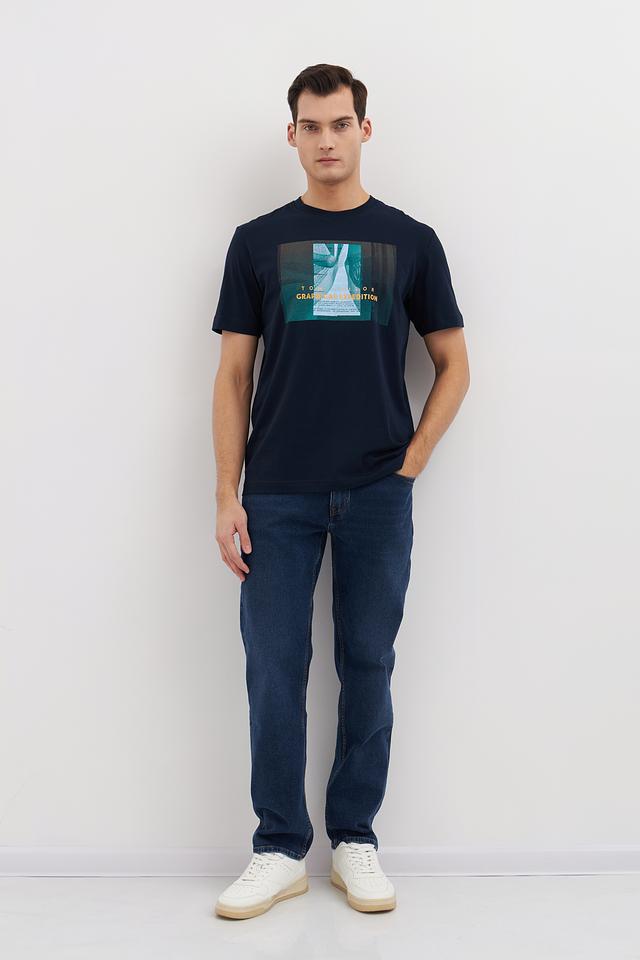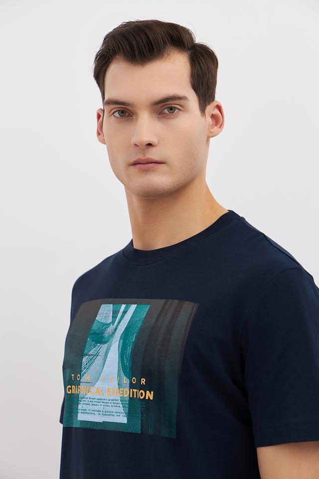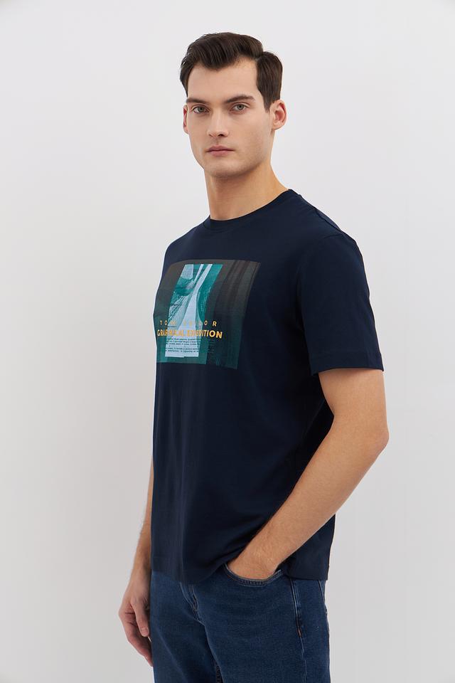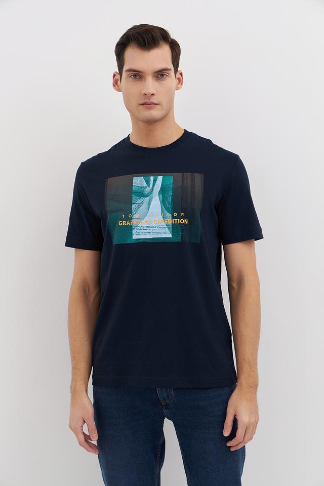 Мужская футболка Tom Tailor Graphic Edition тёмно-синего цвета с ярким графическим принтом на передней части. Изготовлена из 100% хлопка, обеспечивающего комфорт и воздухопроницаемость. Состав: хлопок 100%