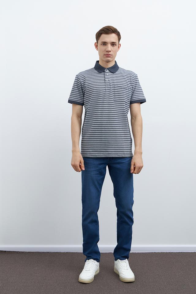 Поло имеет короткий рукав, стандартный воротник и трёхпугочную планку. На левой стороне груди расположен небольшой карман. Воротник и манжеты рукавов отделаны темной полосой, что добавляет контрастности и стиля.