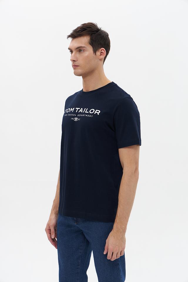 Футболка имеет насыщенный темно-синий цвет (navy), который легко сочетается с другими элементами одежды. На груди расположен фирменный логотип Tom Tailor, выполненный в белом цвете, что добавляет футболке индивидуальности и подчеркивает ее принадлежность к известному бренду.