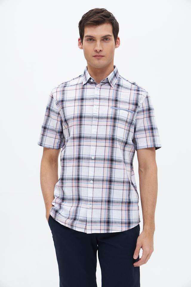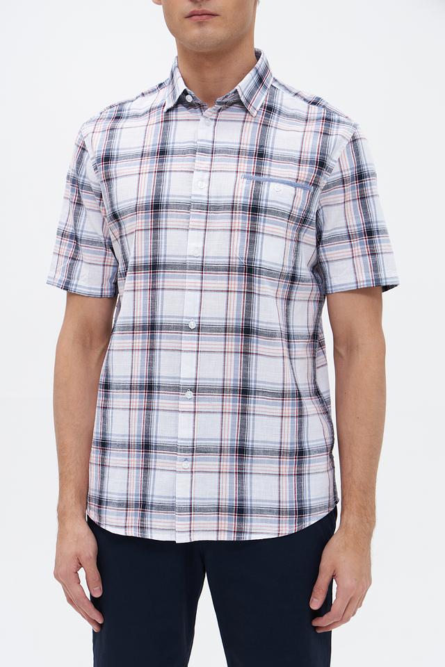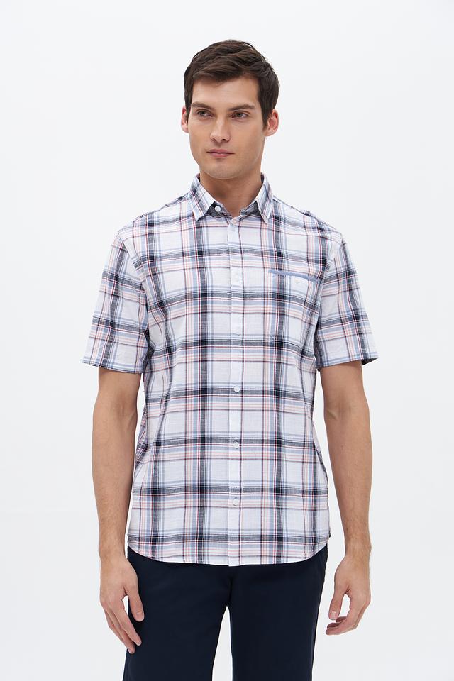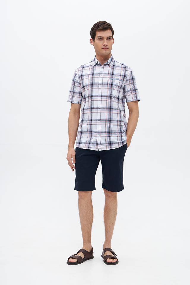 Основной цвет рубашки – белый, но благодаря клетчатому рисунку в синих, красных и серых тонах, она выглядит динамично и интересно. Рисунок клетки придает рубашке универсальность, позволяя сочетать ее с различными брюками и шортами.