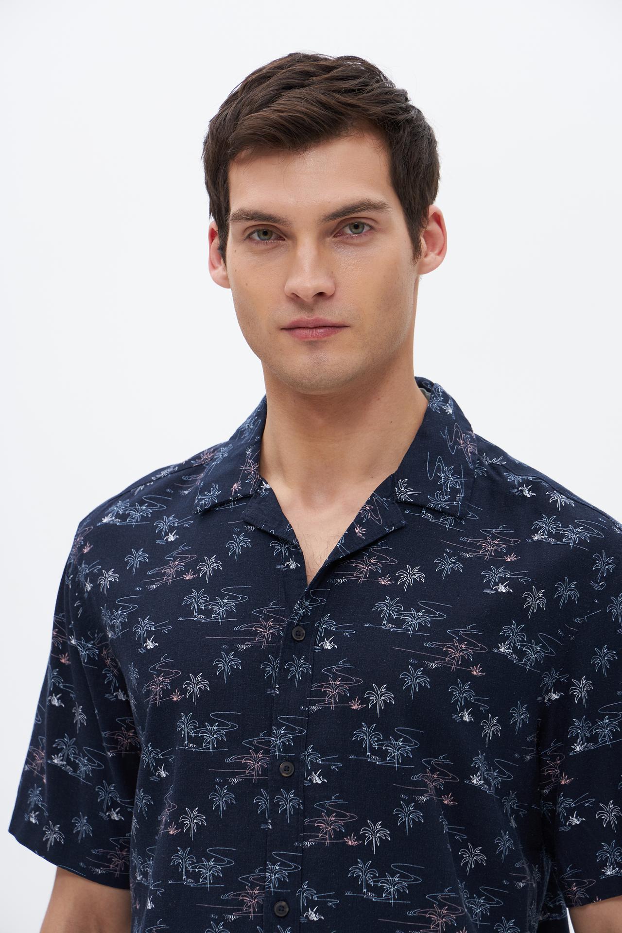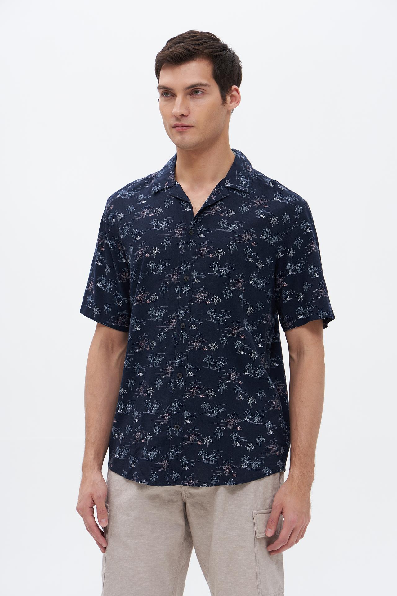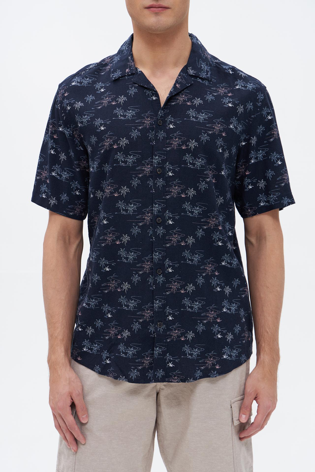 Синяя рубашка украшена оригинальным тропическим принтом с изображениями пальм и морских волн в светлых тонах, что придает ей уникальный и расслабленный вид. Отложной воротник и прямой крой подчеркивают классический силуэт, делая ее универсальной для различных комплектов. Мужская рубашка с принтом легко комбинируется с шортами, брюками или джинсами.