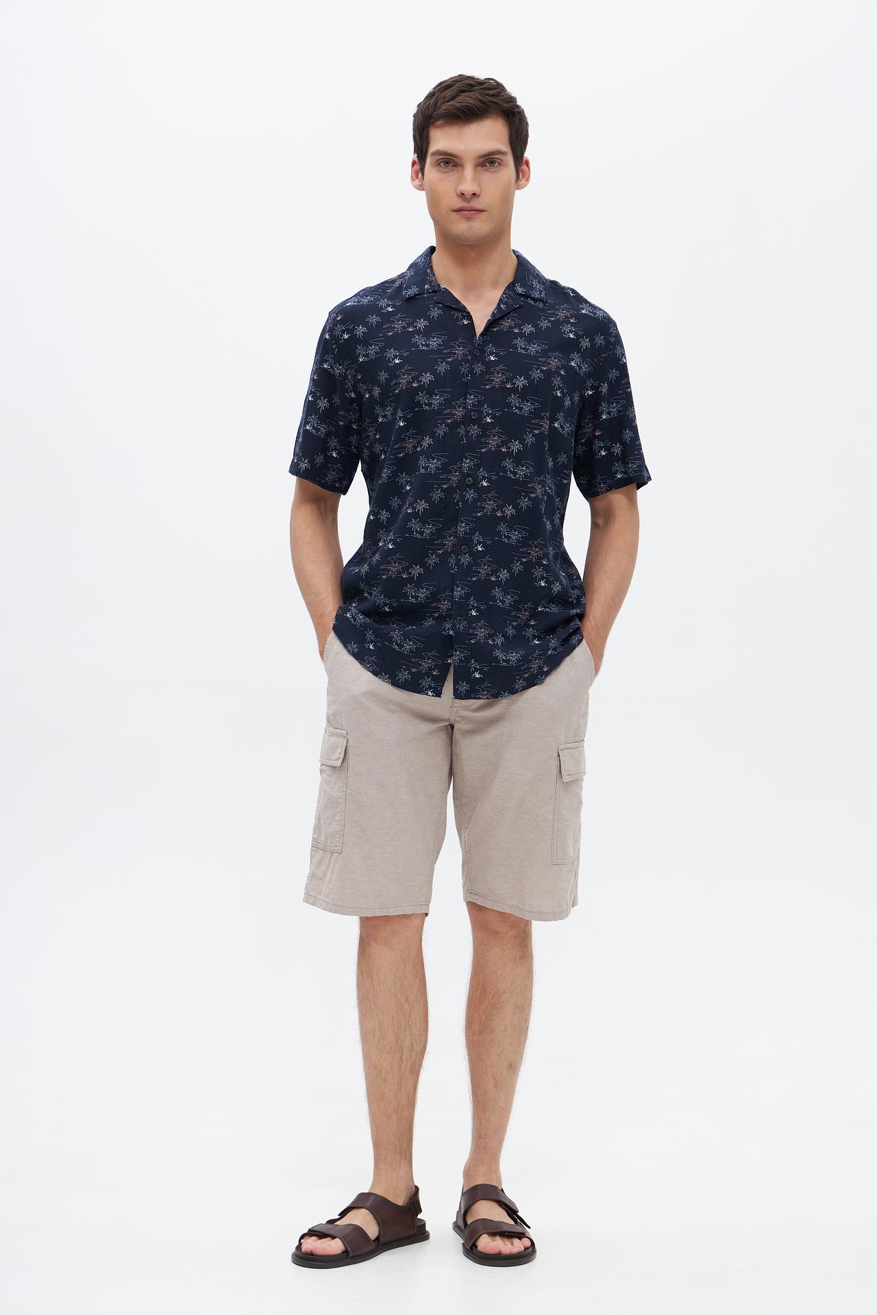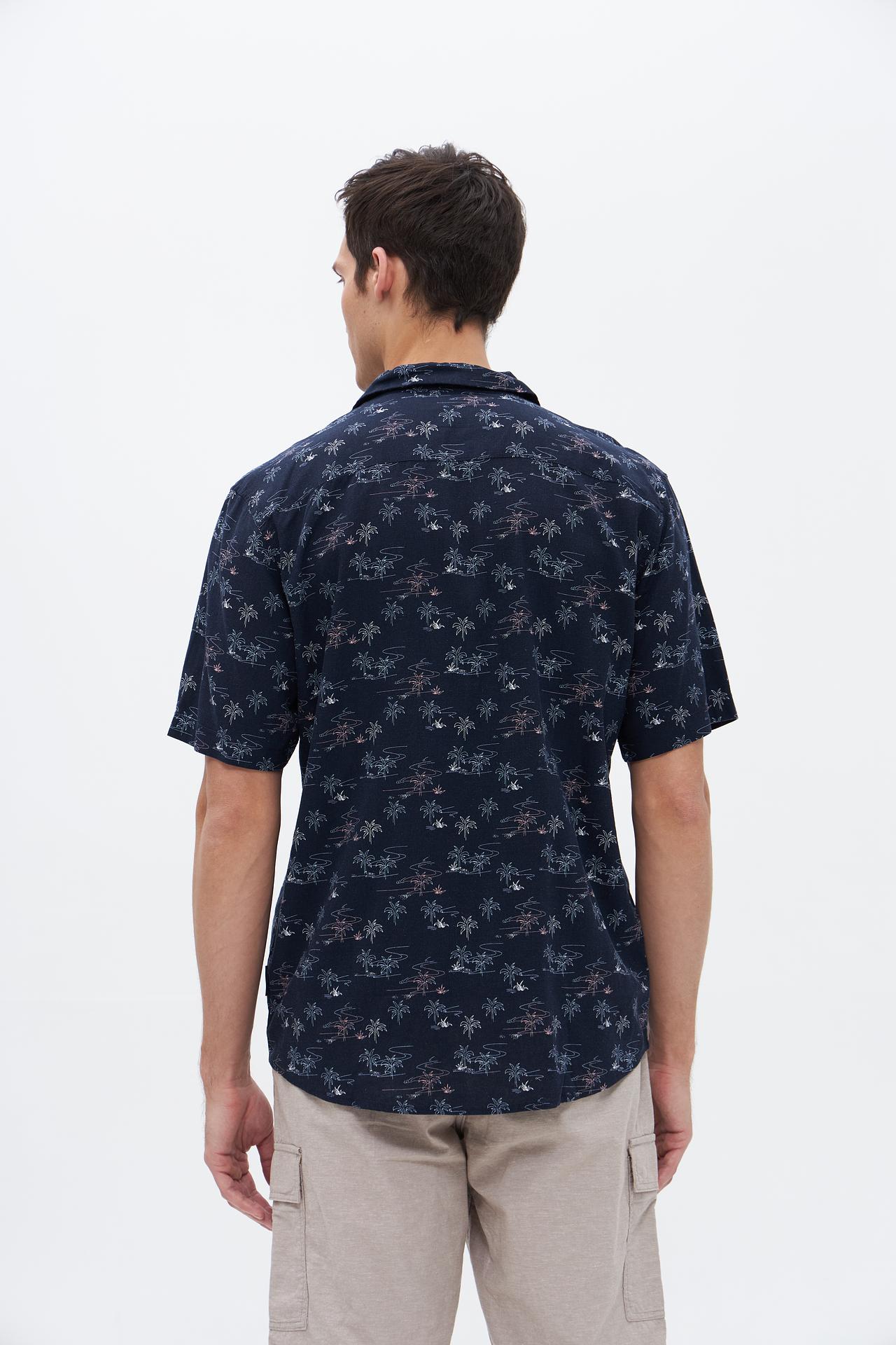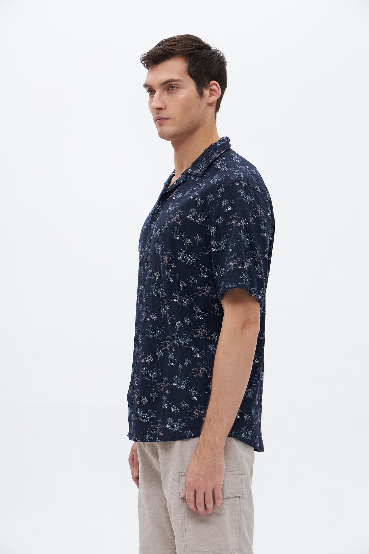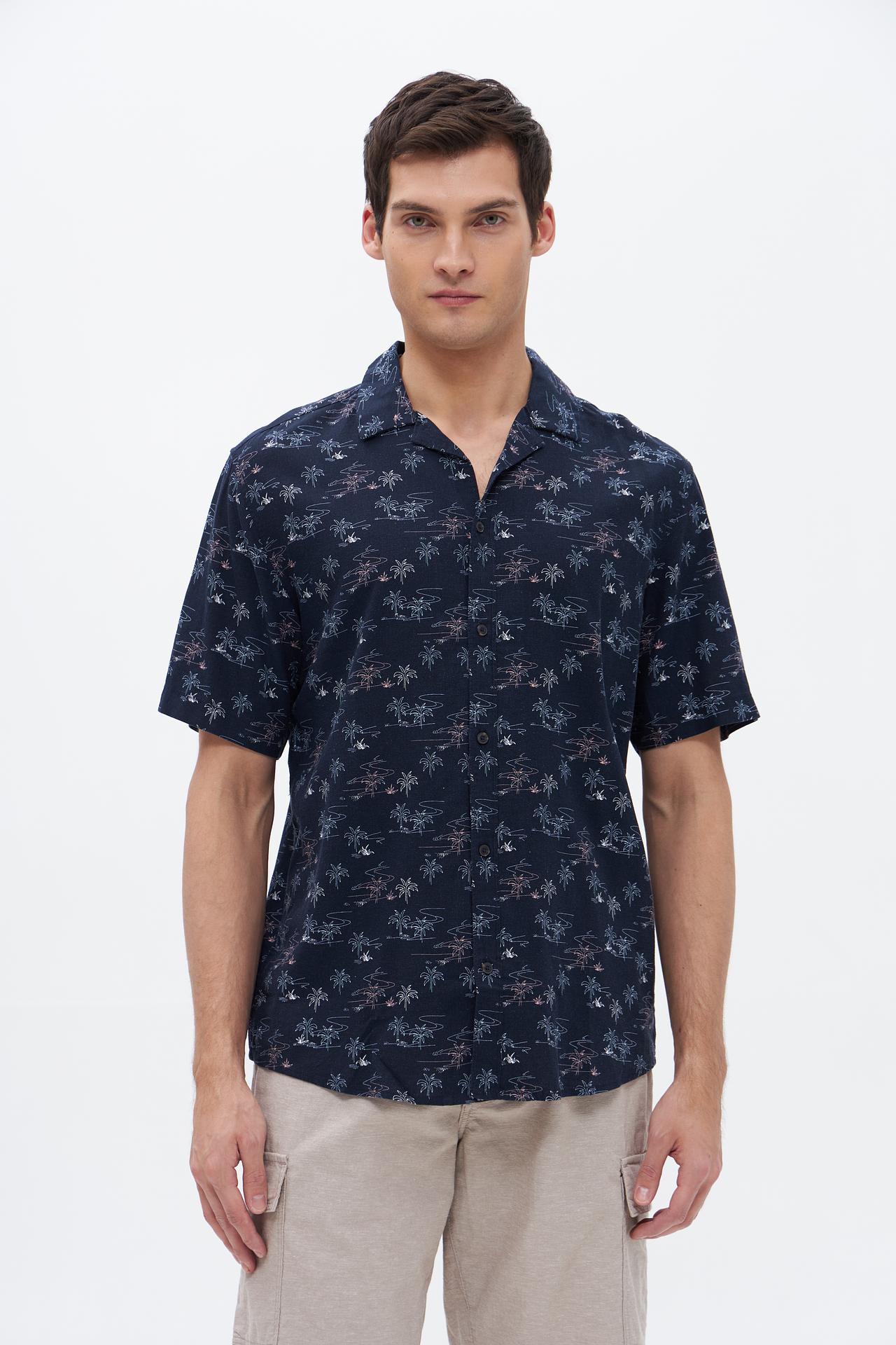 Синяя рубашка украшена оригинальным тропическим принтом с изображениями пальм и морских волн в светлых тонах, что придает ей уникальный и расслабленный вид. Отложной воротник и прямой крой подчеркивают классический силуэт, делая ее универсальной для различных комплектов. Мужская рубашка с принтом легко комбинируется с шортами, брюками или джинсами.