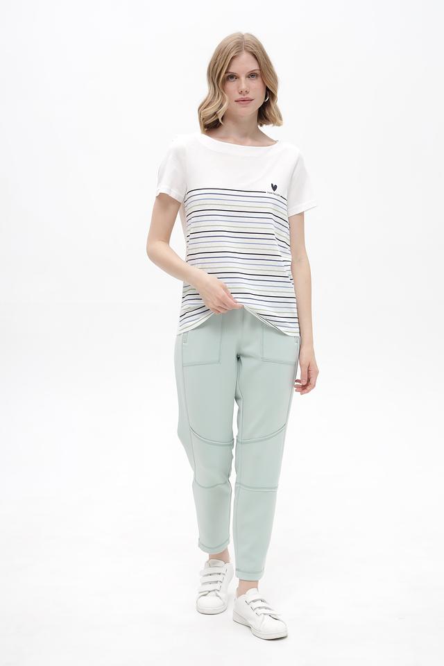 Женская футболка от бренда Tom Tailor выполнена в белом цвете с горизонтальными полосами синего, зелёного и серого оттенков. Модель имеет прямой крой, короткие рукава и круглый вырез горловины.