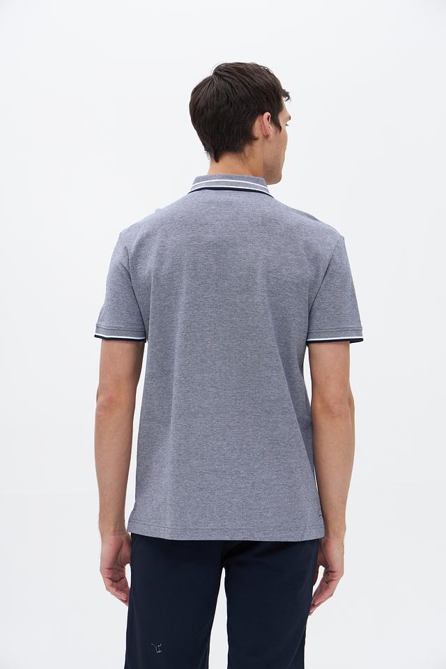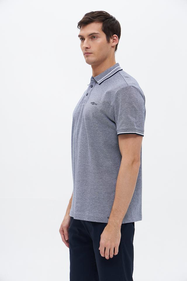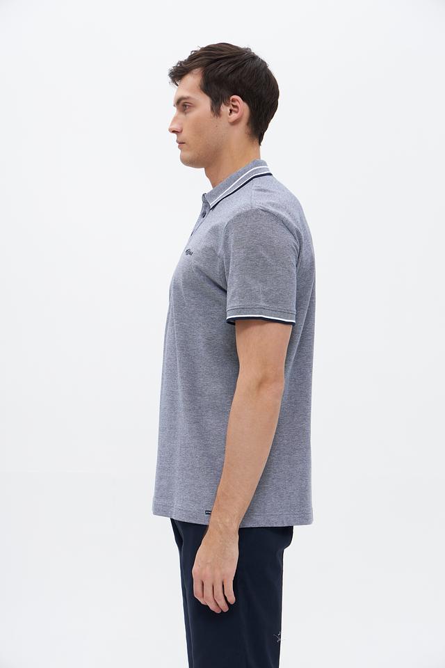 Основной цвет изделия – серый меланж, который отлично сочетается с различными элементами одежды. Воротник и короткие рукава поло имеют контрастную белую полоску, что придает модели особый шарм и динамичный вид. На груди расположена небольшая вышивка с логотипом бренда.