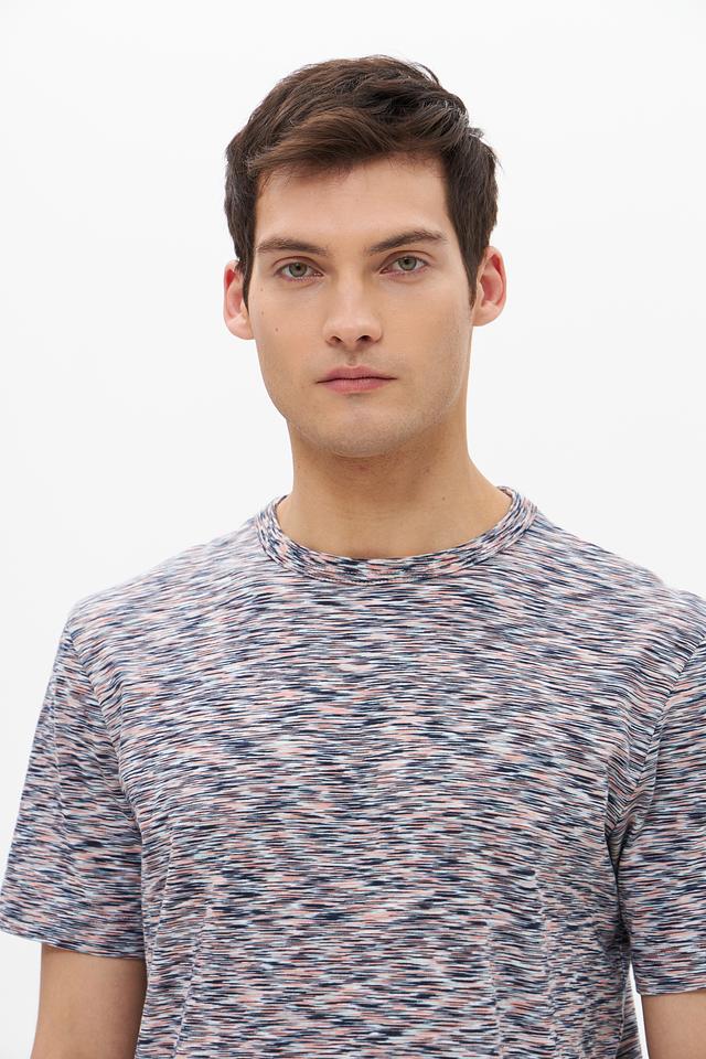Особенностью данной модели является её уникальный меланжевый рисунок, сочетающий в себе различные оттенки серого, синего и розового. Это придает футболке стильный и современный вид.