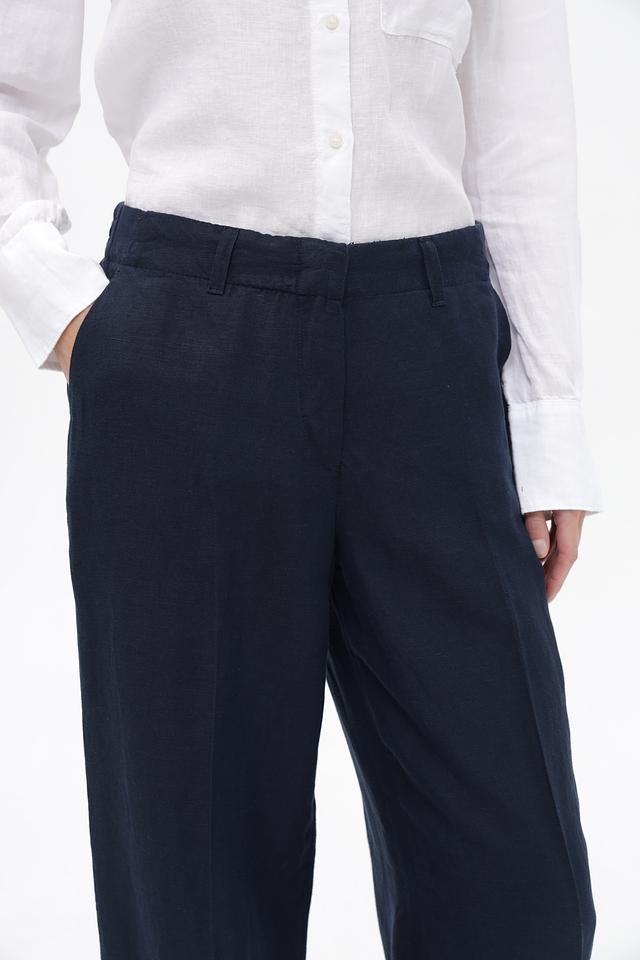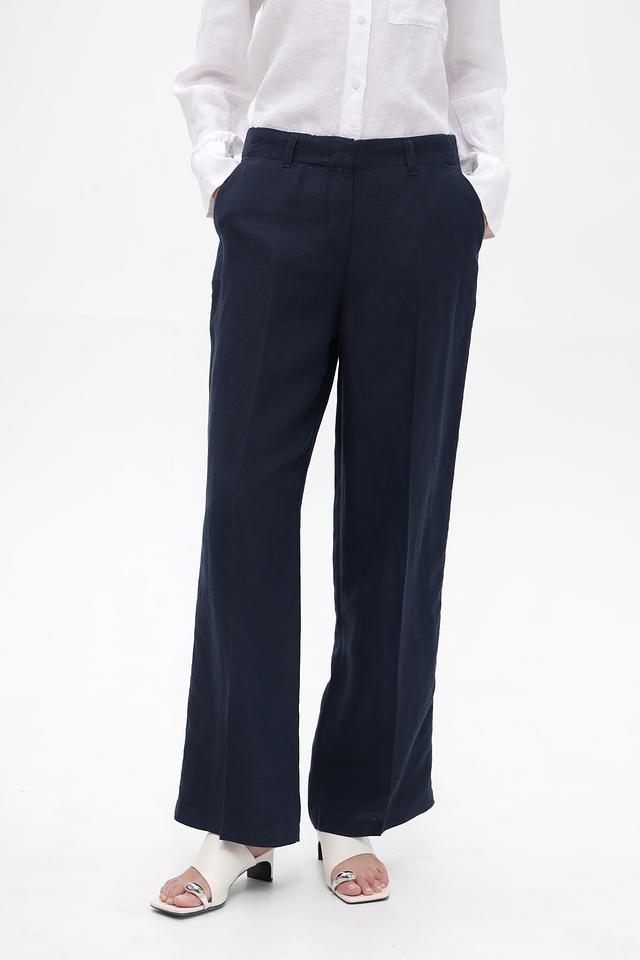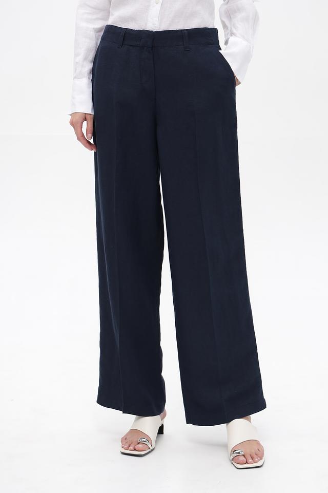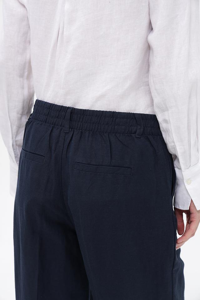 Женские брюки палаццо от Tom Tailor темно-синего цвета, выполнены из натурального льна с добавлением вискозы для комфорта. Модель с эластичной талией и боковыми карманами. Состав: лен 55%, вискоза 45%