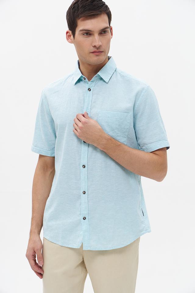 Рубашка имеет классический крой с короткими рукавами и стандартным воротником. Мятный цвет придает образу свежесть и легкость, а однотонный дизайн позволяет сочетать рубашку с различными брюками и шортами.