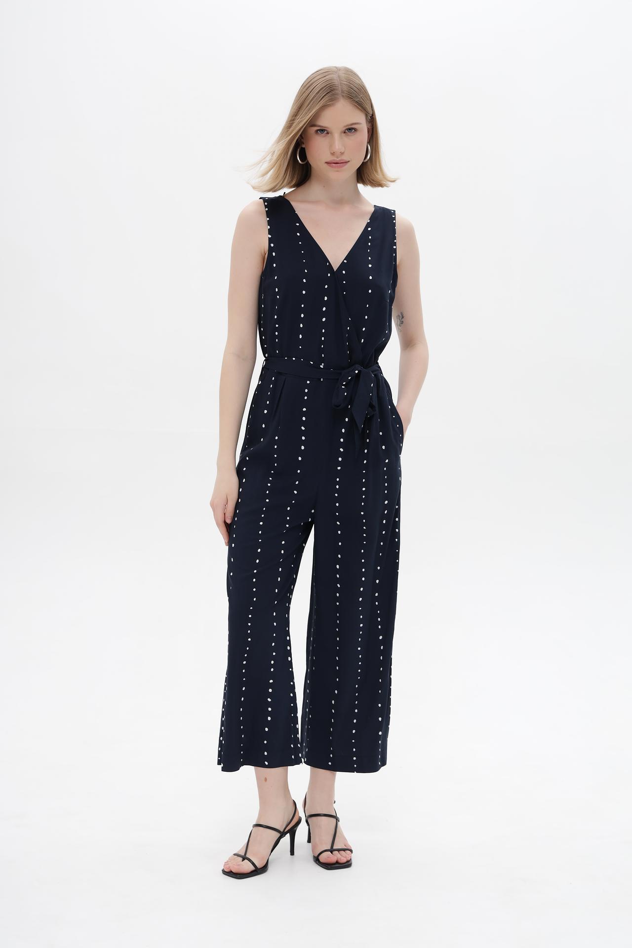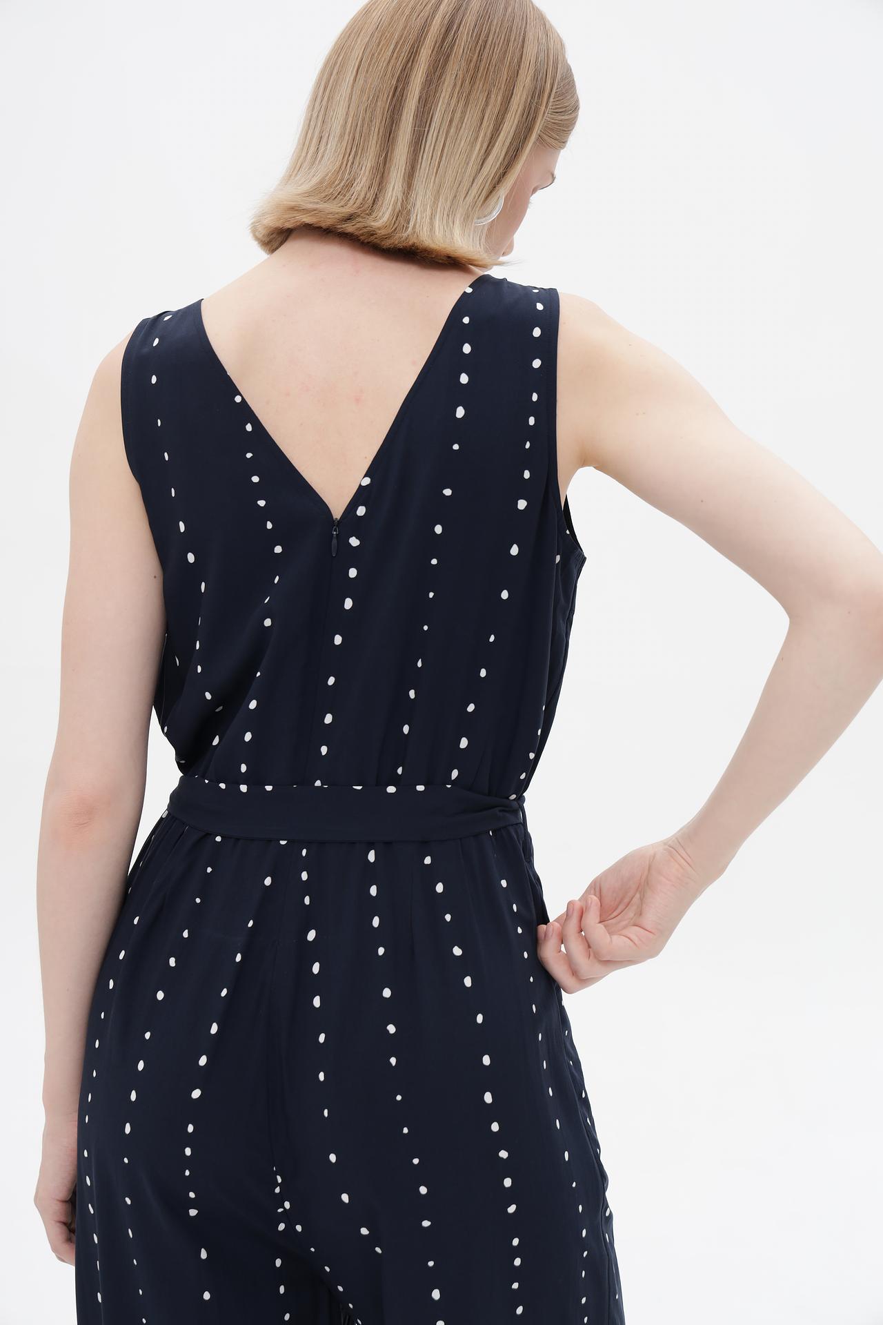 - Дизайн: Элегантный комбинезон с V-образным вырезом и поясом. Вертикальный принт визуально вытягивает силуэт.