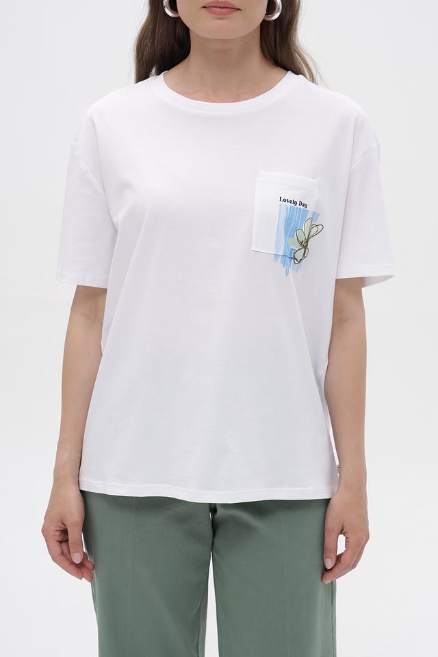 Особенностью данной модели является оригинальный принт на нагрудном кармане, который добавляет ей индивидуальности и стиля. Футболка имеет свободный крой, что делает ее удобной для повседневной носки.