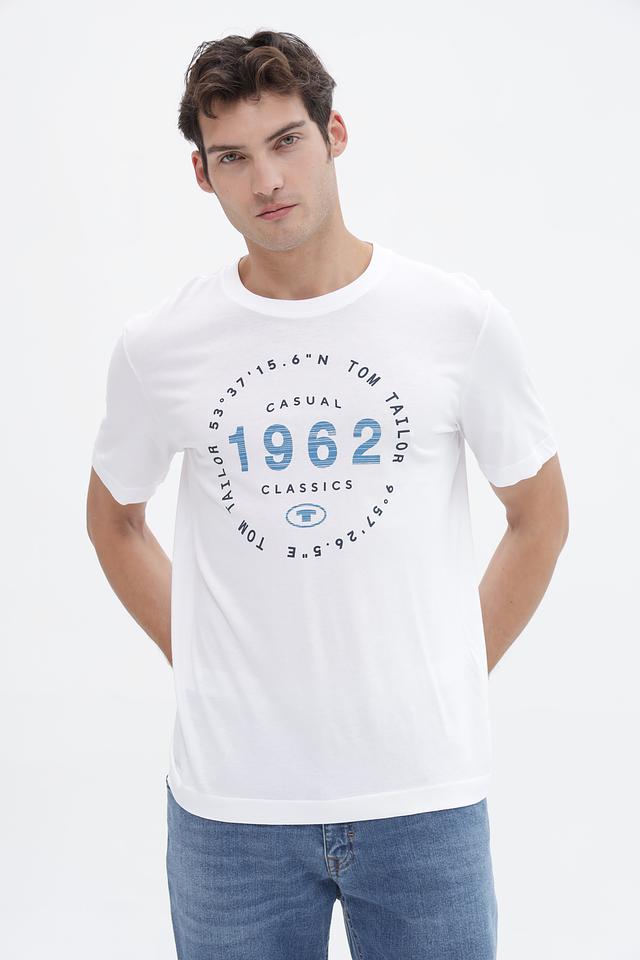 Белая футболка Tom Tailor CASUAL 1962 из 100% хлопка с круглым вырезом и оригинальным принтом на передней части. Идеальный выбор для создания повседневного образа. Состав: хлопок 100%
