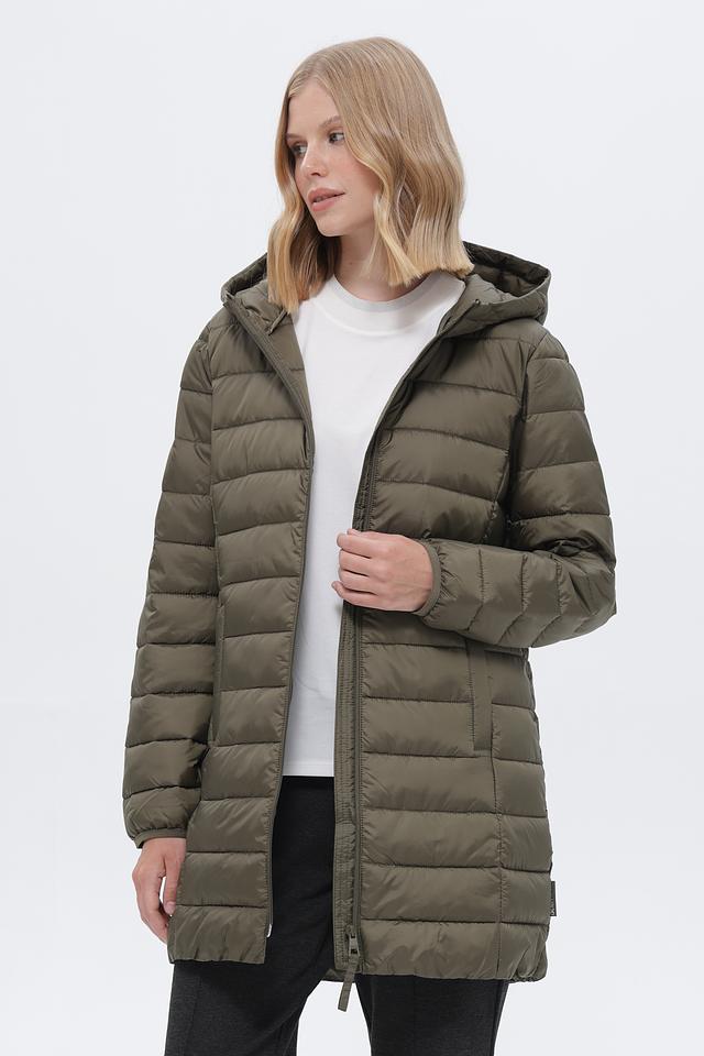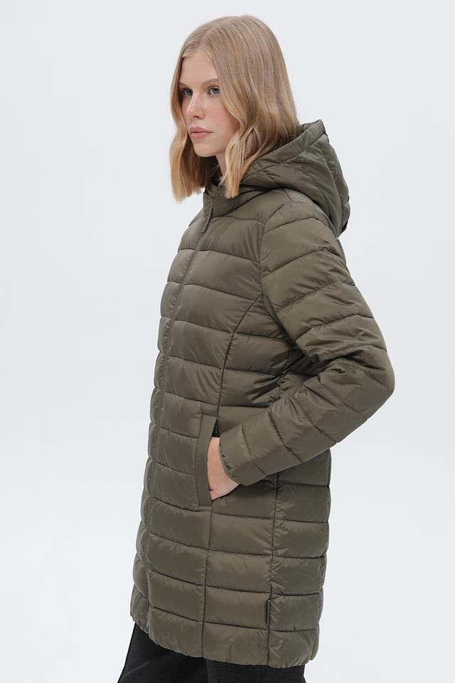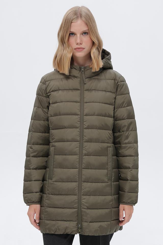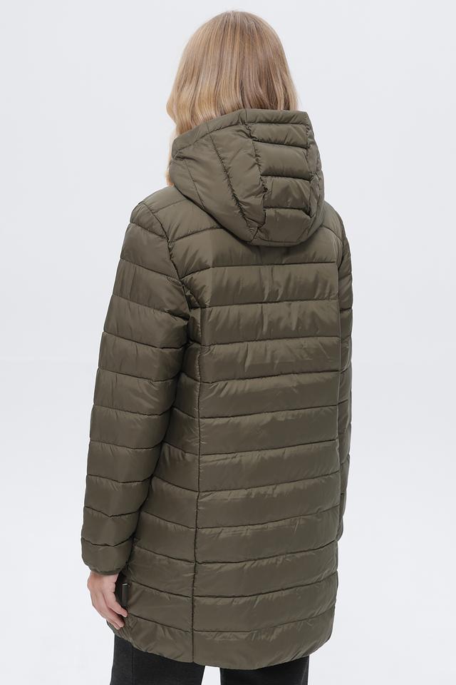 Пальто имеет стеганую структуру, капюшон и застегивается на молнию по всей длине. Два боковых кармана обеспечивают удобство хранения мелочей. Длина пальто – до середины бедра, что делает его подходящим для повседневной носки.