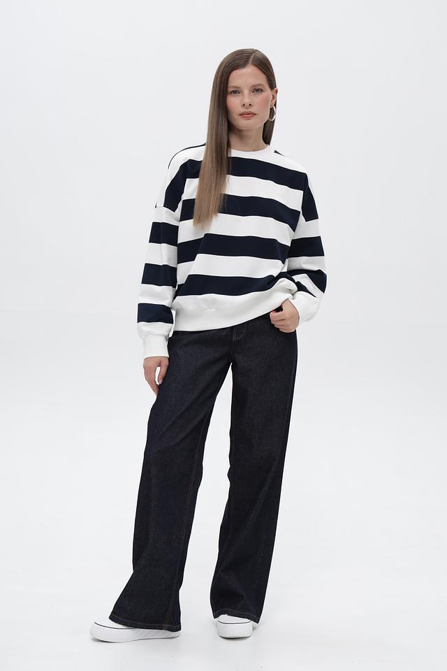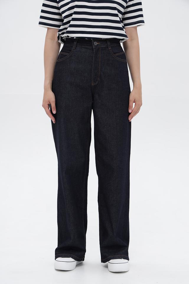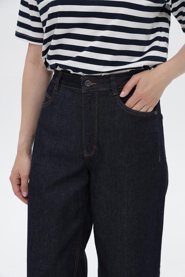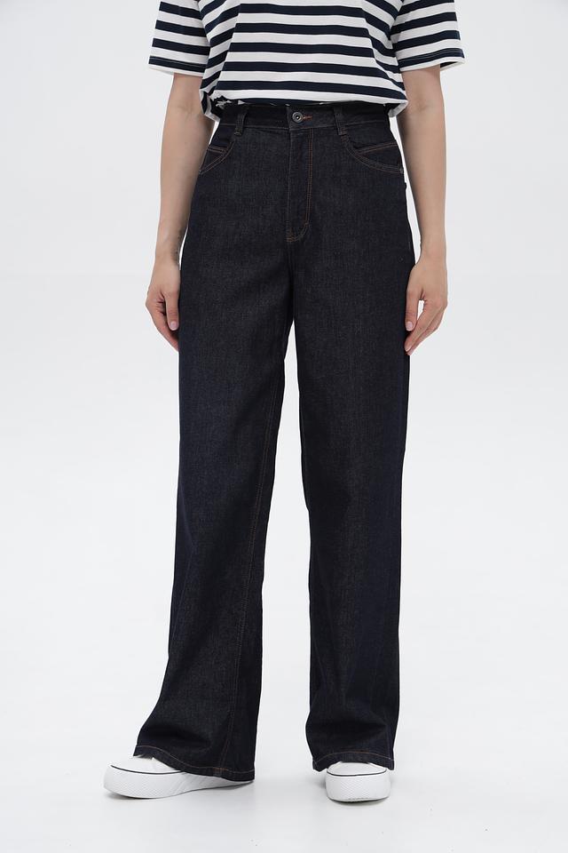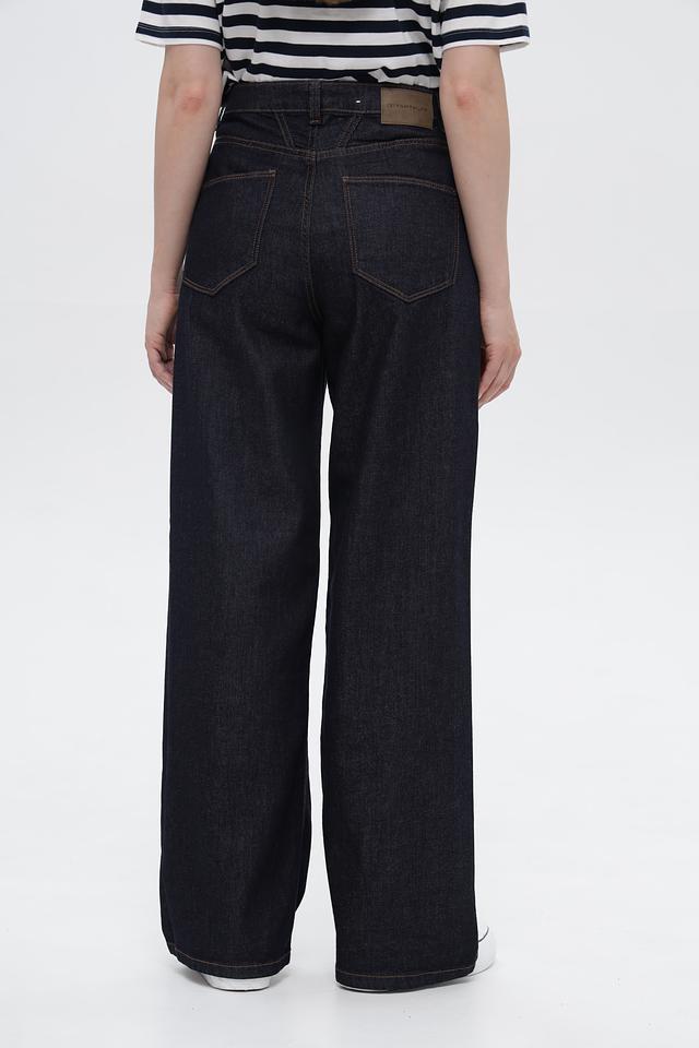 Джинсы имеют высокую посадку, которая визуально удлиняет ноги и делает силуэт более стройным. Широкие штанины создают эффектный клеш, добавляя образу женственности и динамики. Классический крой с пятью карманами и поясными петлями обеспечивает удобство и функциональность.