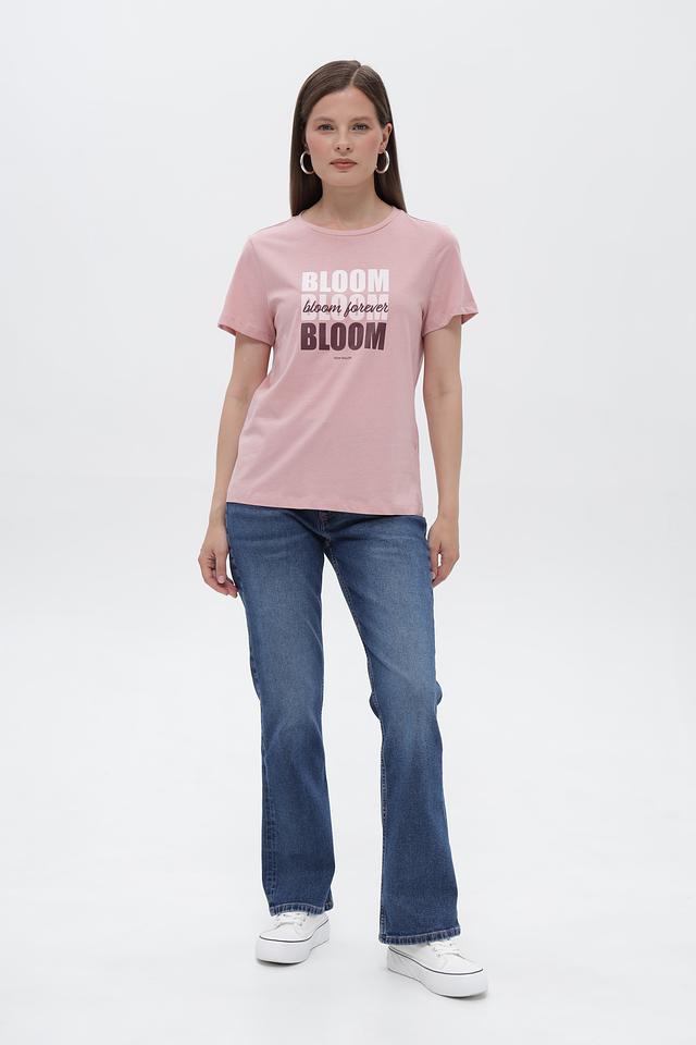 Особенность данной модели – эффектный принт “Bloom” с надписью “bloom forever” на лицевой стороне, который добавляет образу оригинальности. Футболка имеет классический крой с круглым вырезом горловины и короткими рукавами.