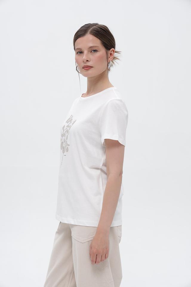 Футболка имеет прямой крой и круглый вырез горловины. Основным декоративным элементом является принт с изображением ветки с листьями, выполненный в нежных серых оттенках. Принт расположен в центральной части изделия.
