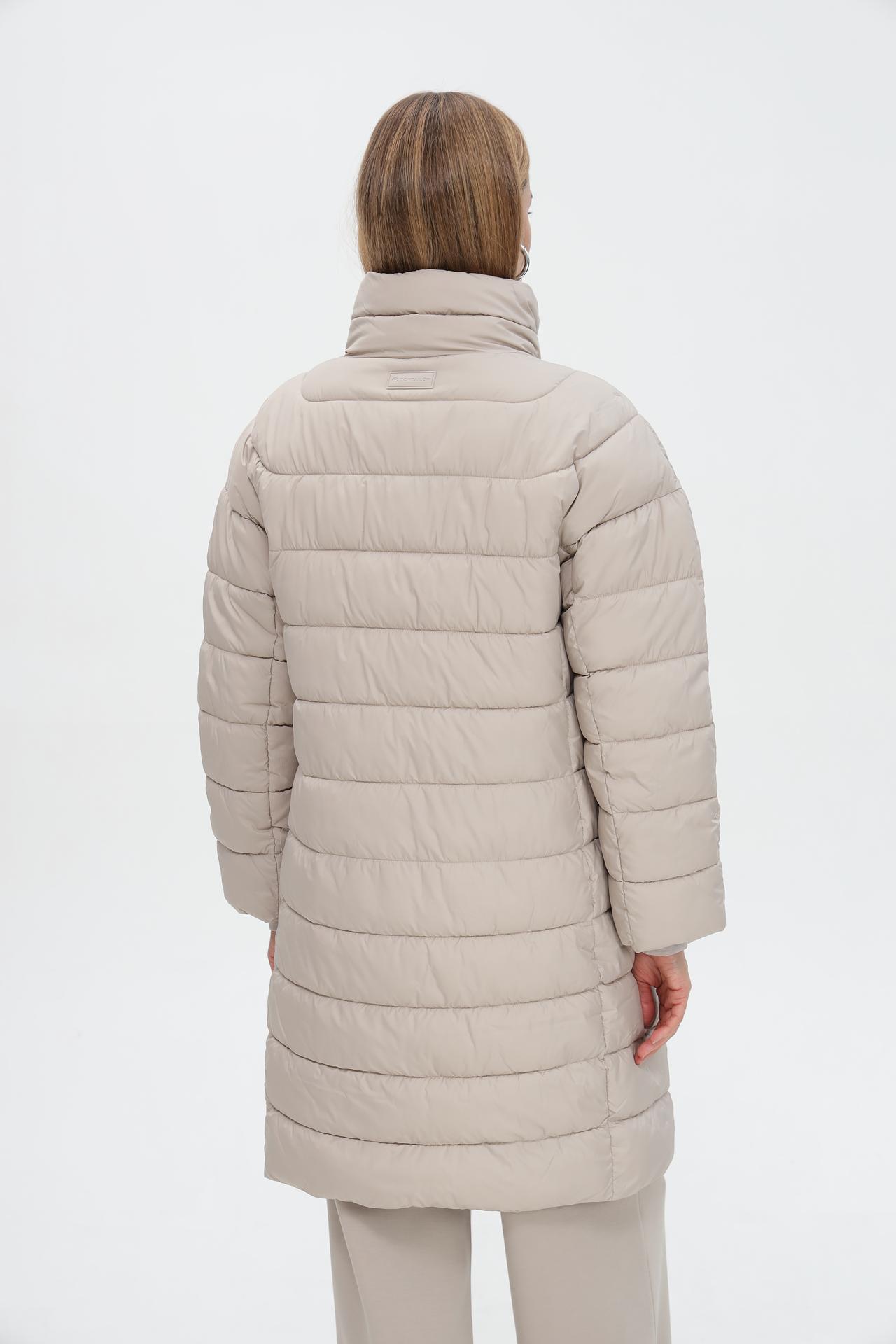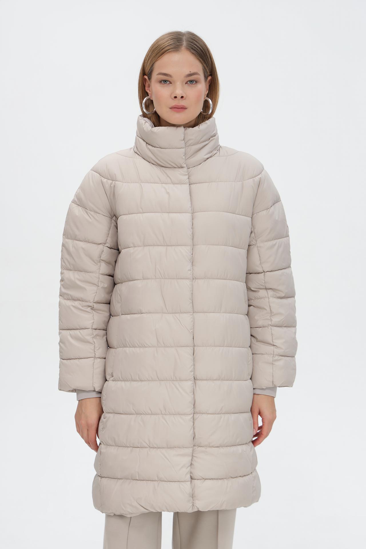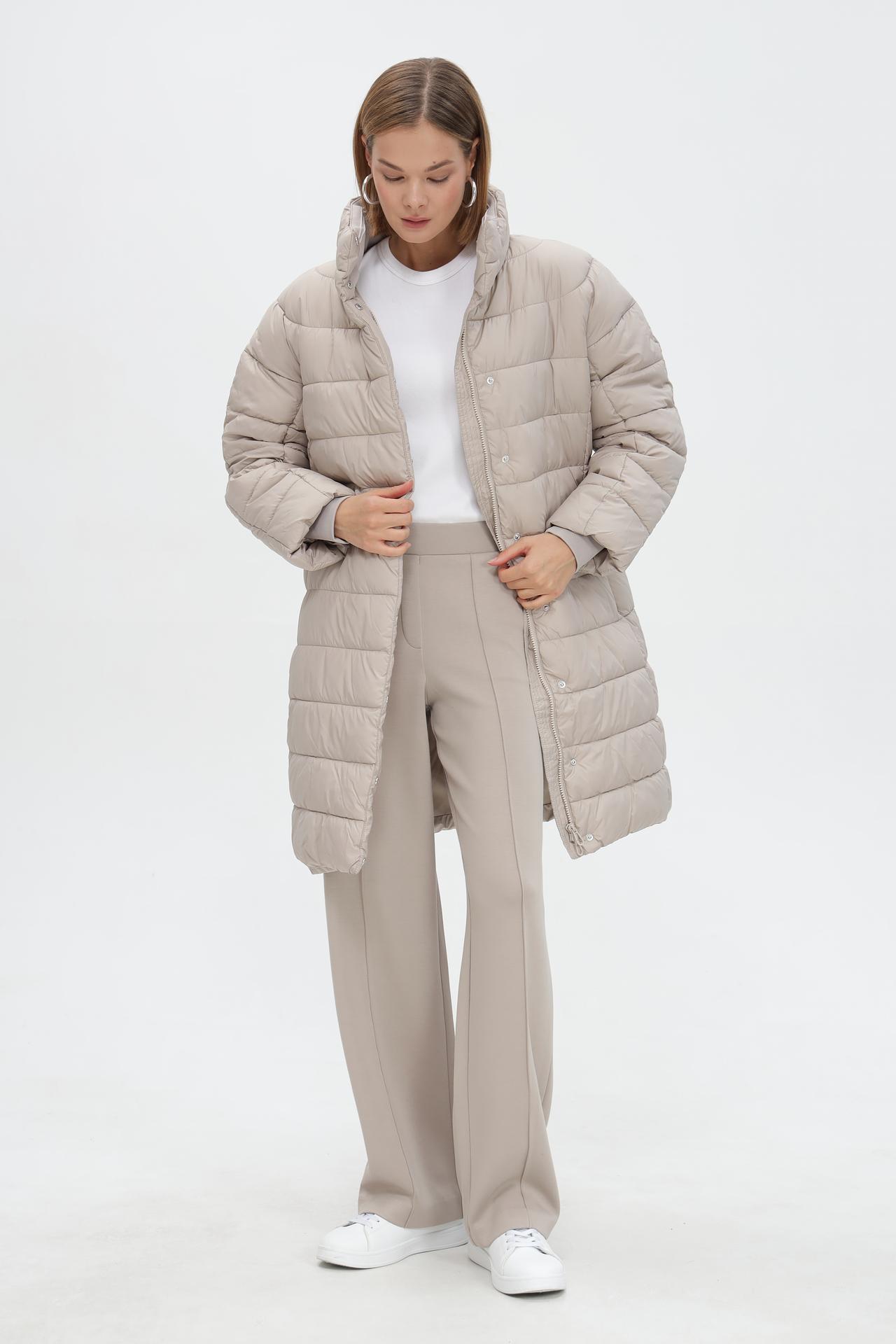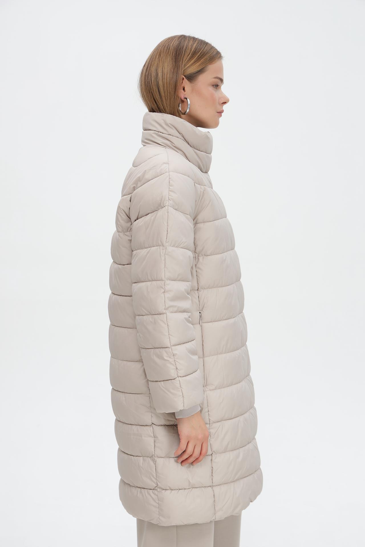 - Дизайн: Классическое пальто средней длины с высоким воротником-стойкой. Прямой крой и горизонтальная стежка создают элегантный силуэт.