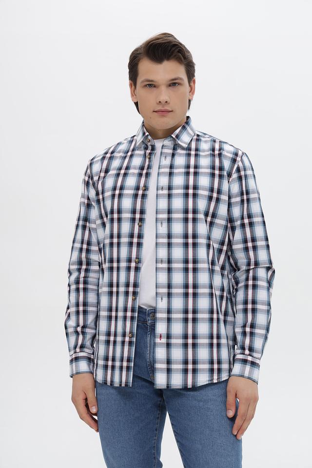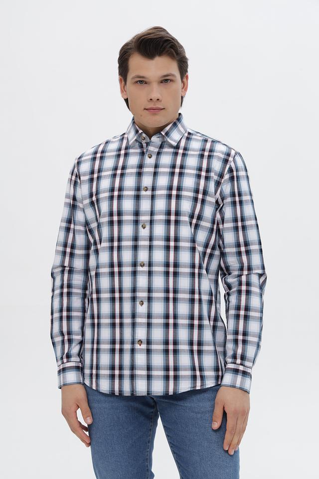 Цветовая гамма рубашки включает в себя сочетание синего, белого и бордового цветов, создавая стильный и современный образ. Рубашка имеет стандартную посадку, подходящую для большинства типов фигур. Застежка на пуговицах обеспечивает надежную фиксацию.