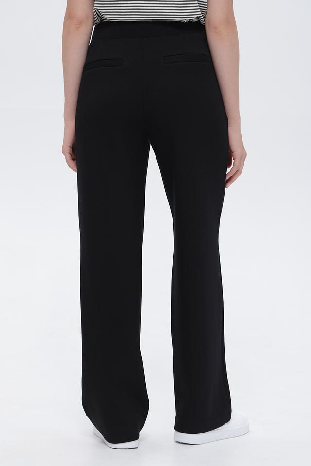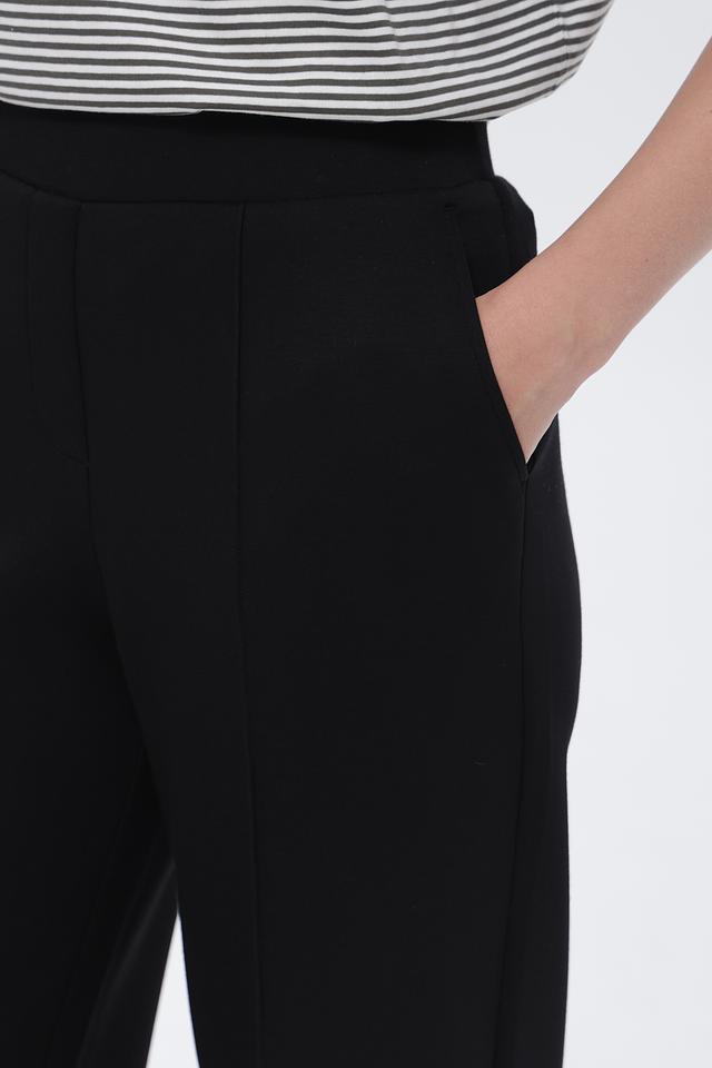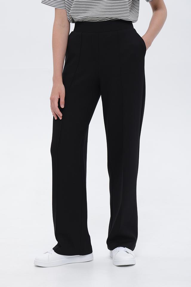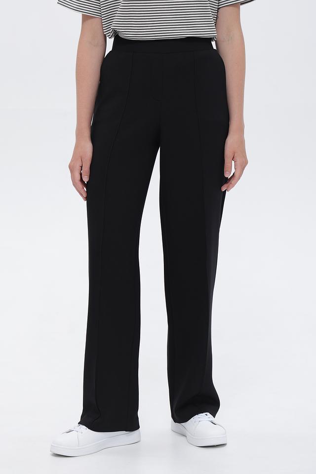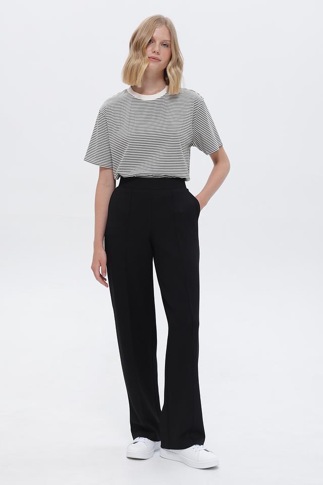Брюки имеют высокую посадку и прямой крой, который визуально удлиняет ноги и создает стройный силуэт. Пояс на резинке обеспечивает максимальный комфорт в носке и позволяет брюкам идеально адаптироваться к фигуре.