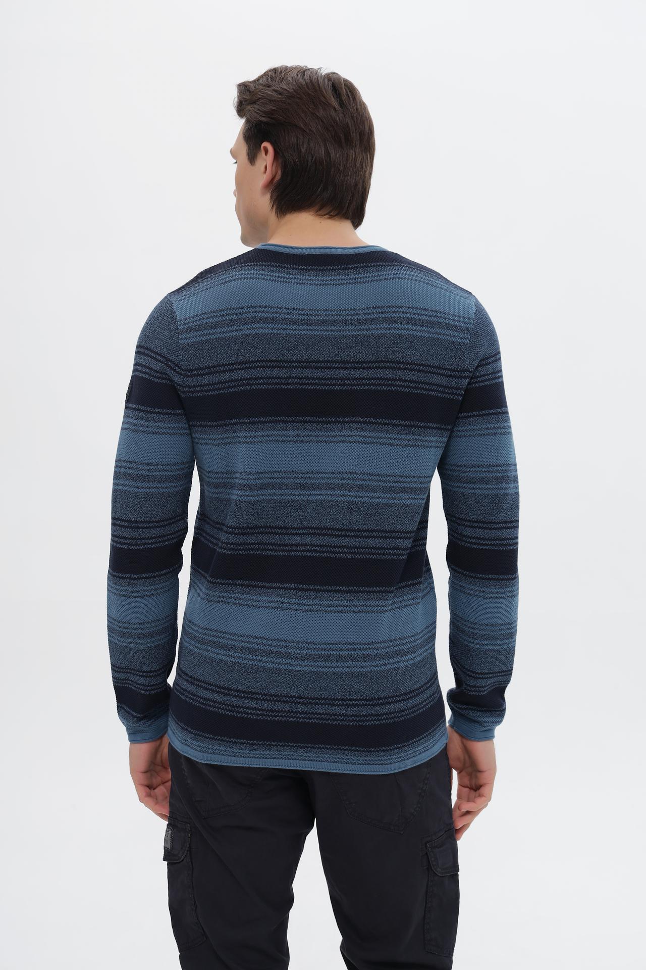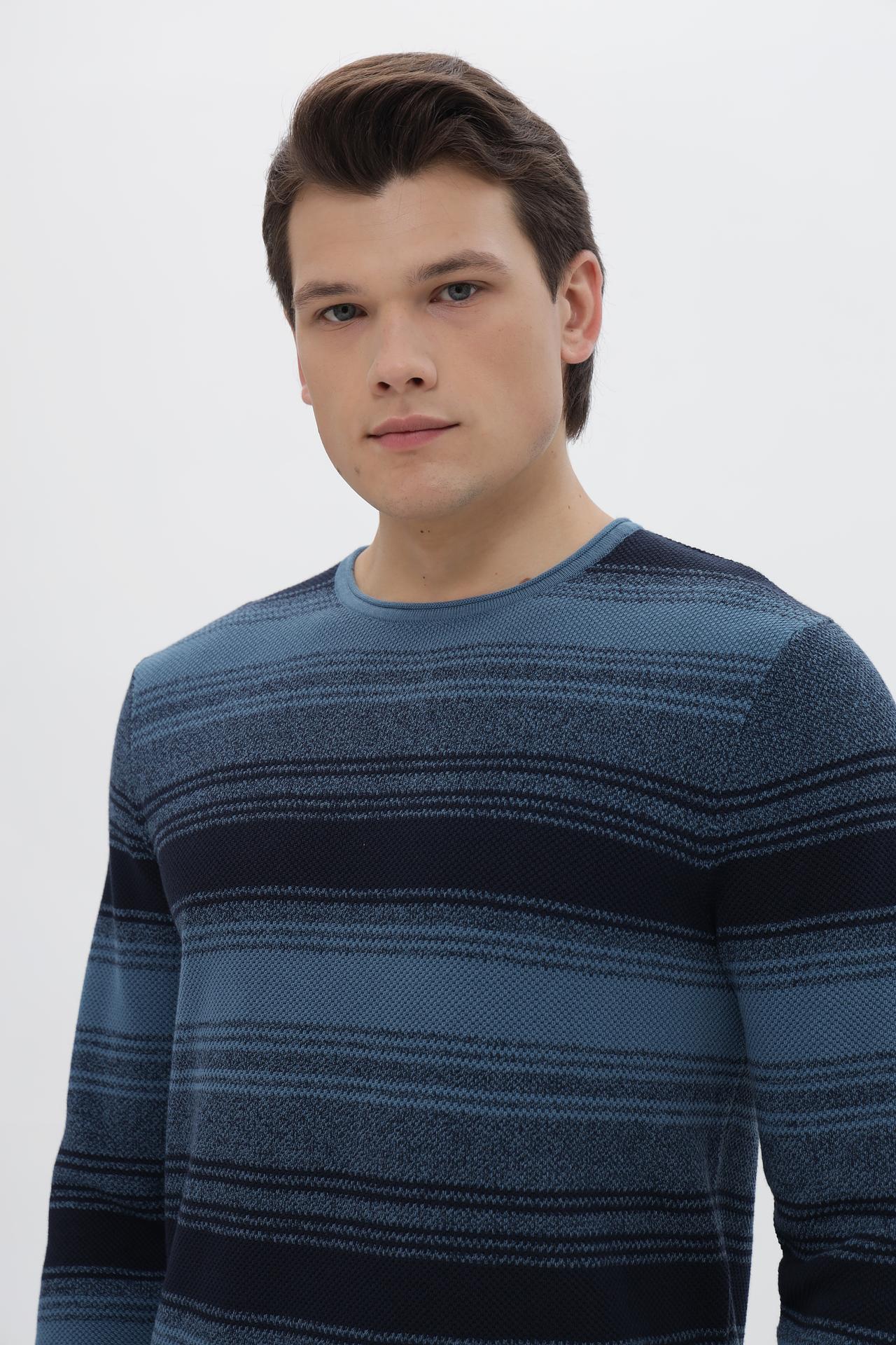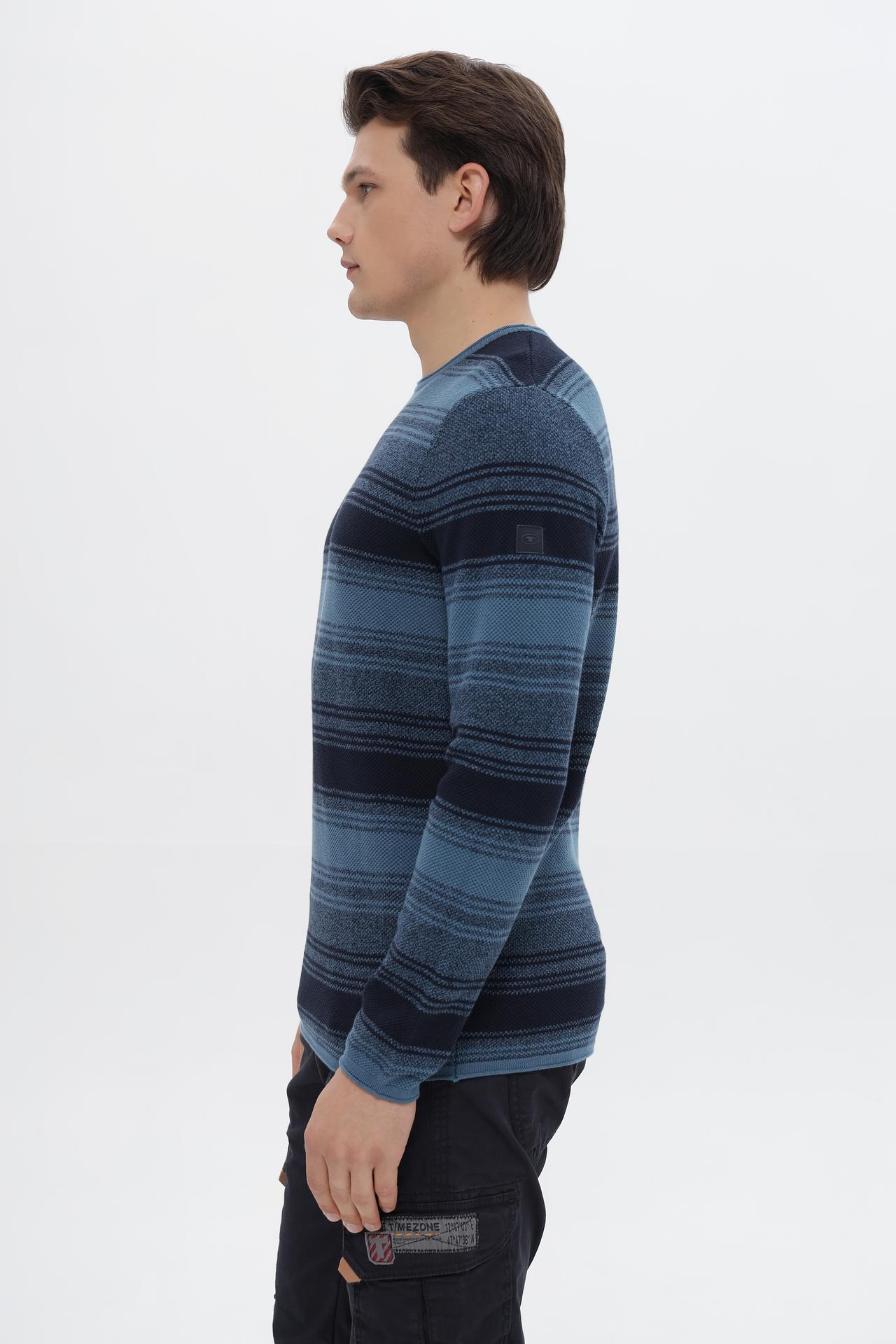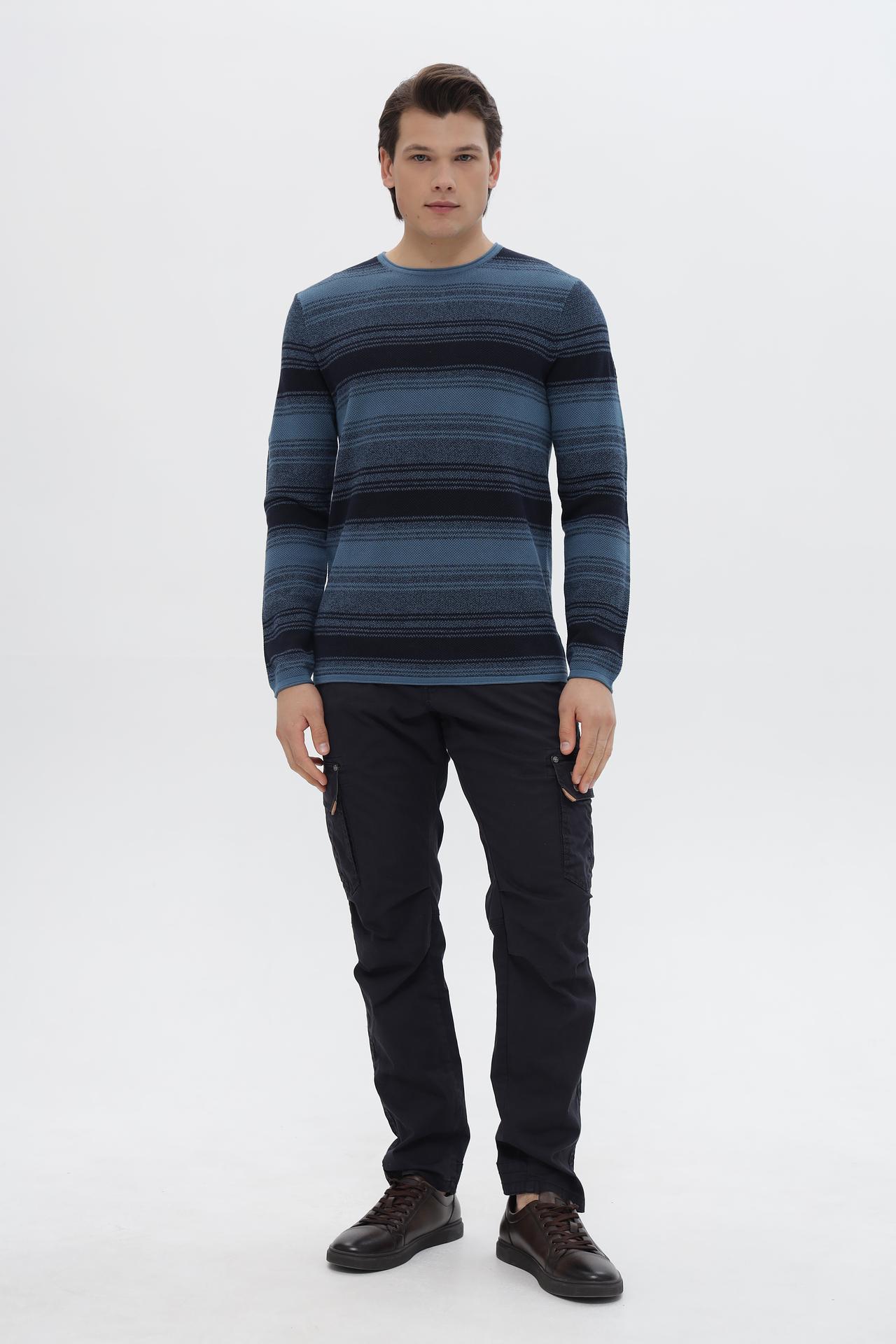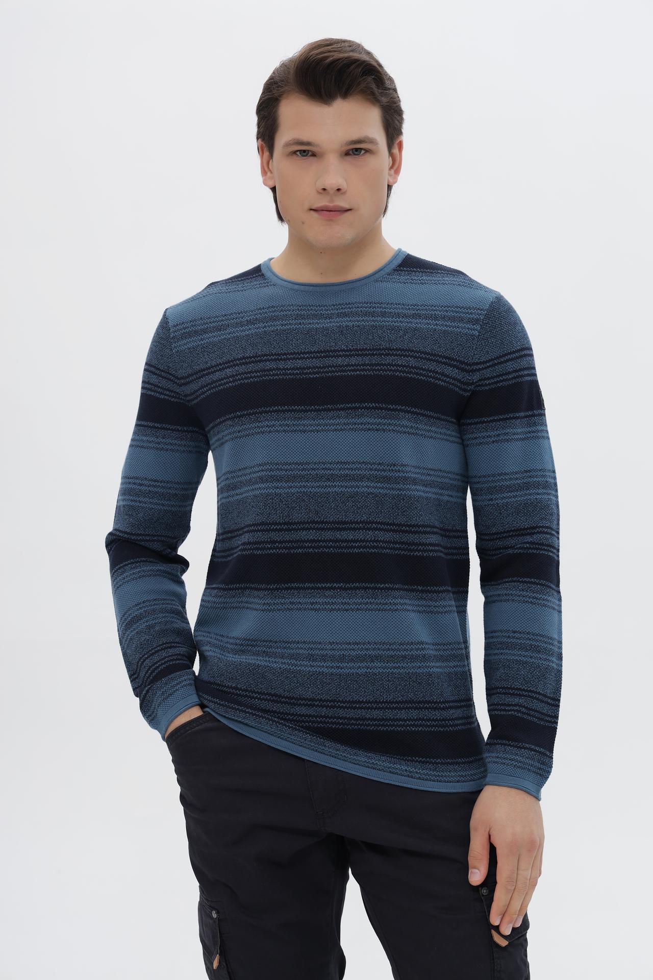 Классический мужской джемпер от Tom Tailor, выполненный в синих и черных тонах. Модель украшена стильным горизонтальным принтом в виде полос, которые создают эффект градиента. Этот джемпер станет отличным дополнением к вашему повседневному гардеробу, обеспечивая комфорт и элегантность.