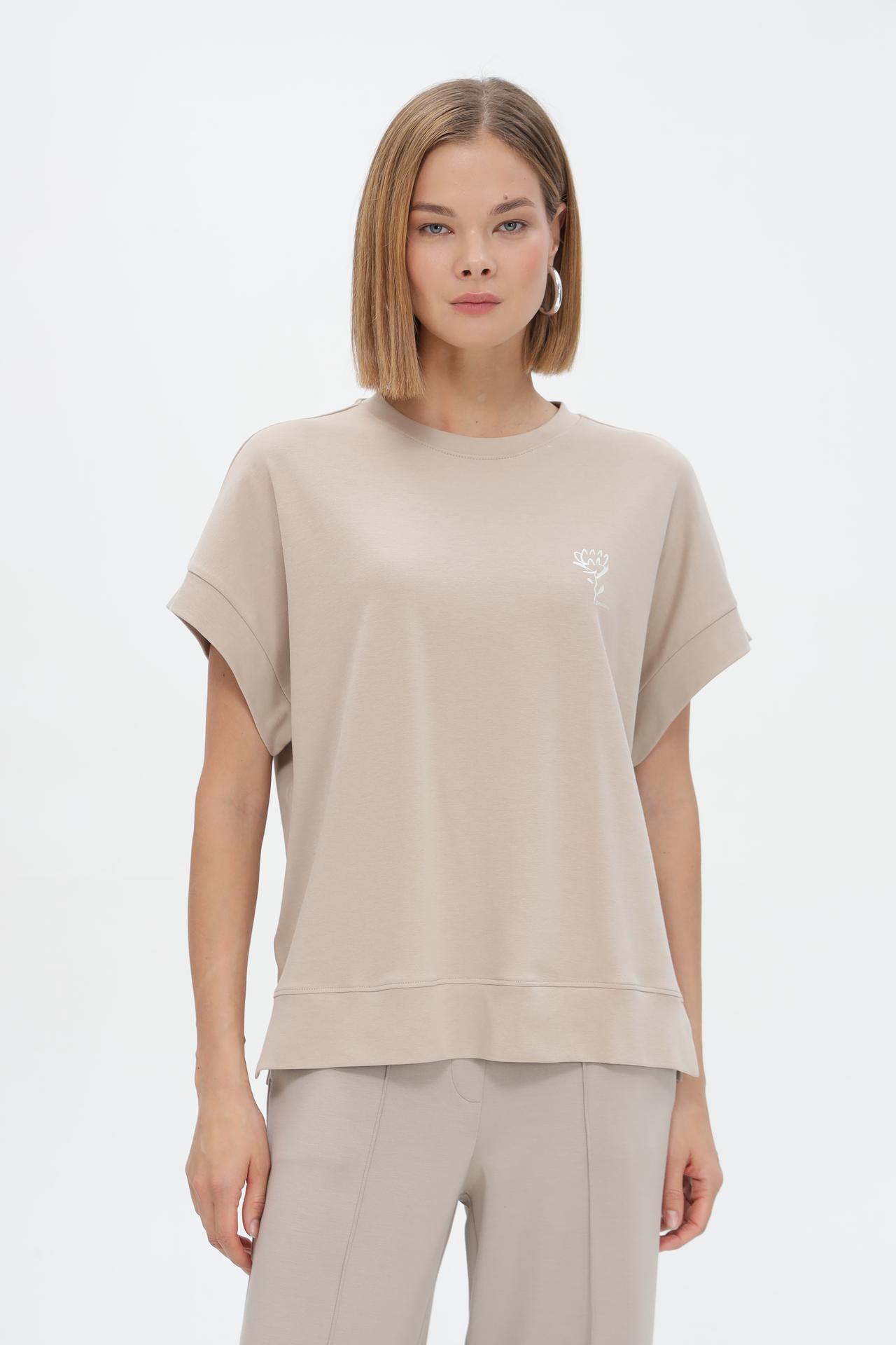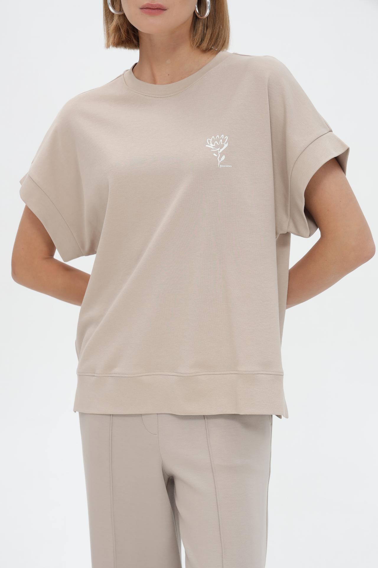 - Дизайн: Классический круглый вырез и короткие рукава с отворотами. Минималистичный дизайн с деликатным принтом делает эту футболку универсальной для создания различных образов.