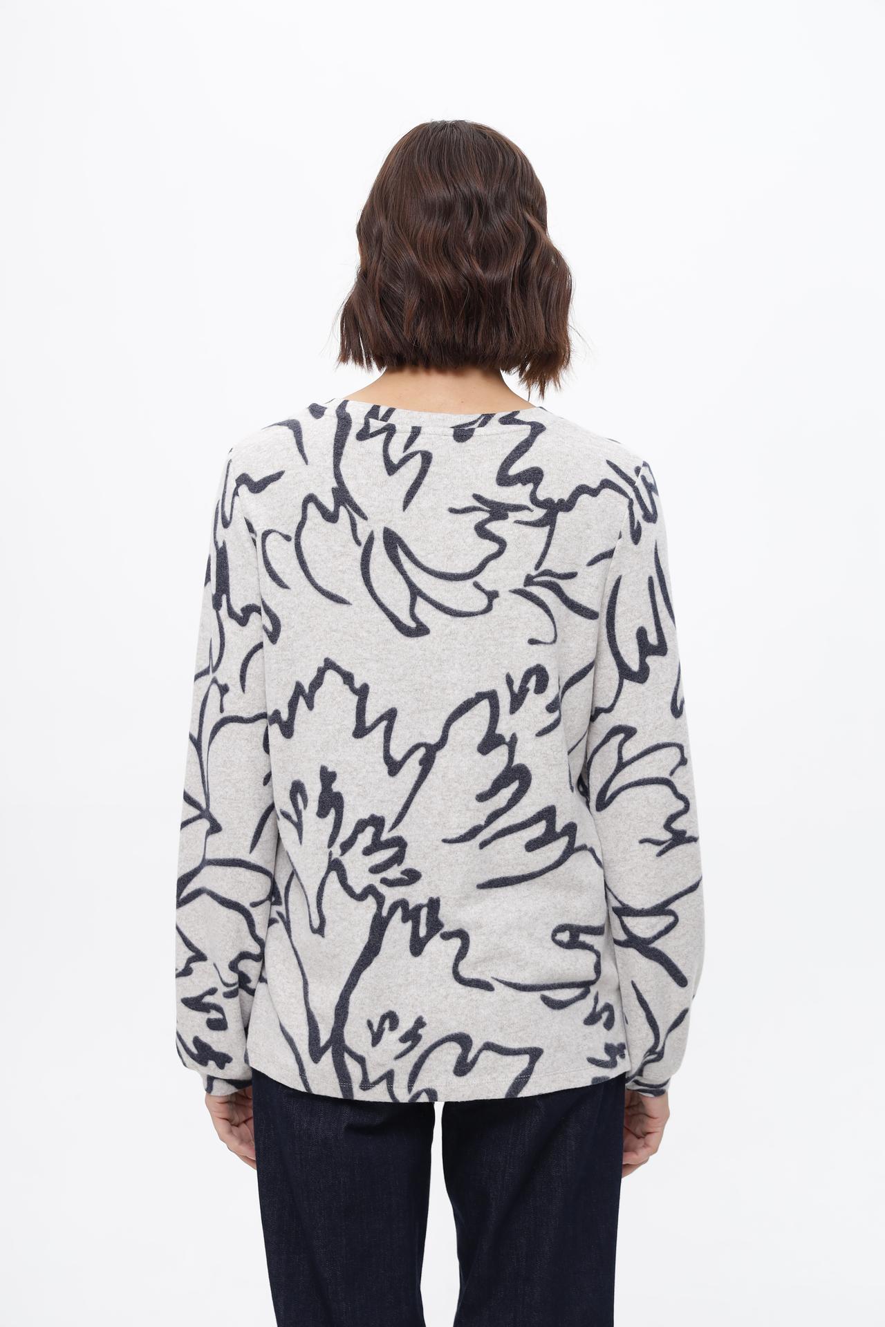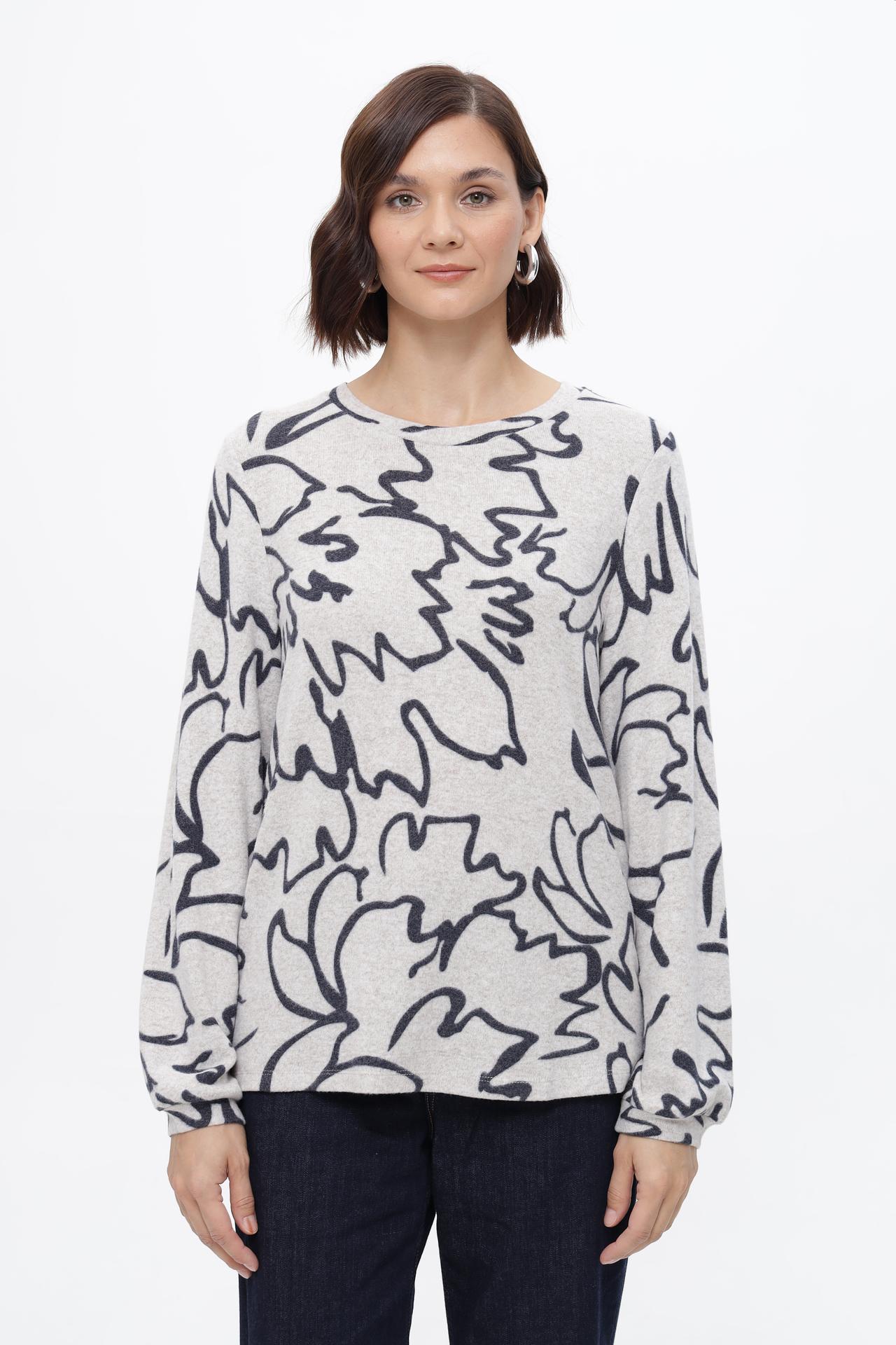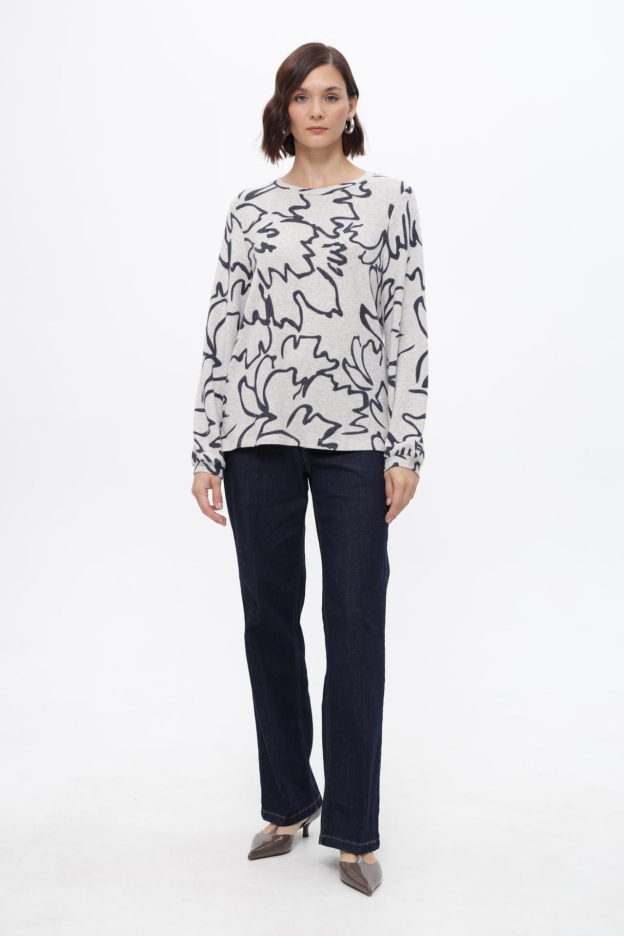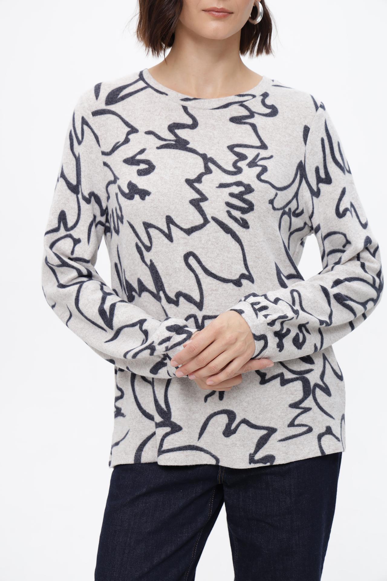 - Дизайн: Классический прямой крой с длинными рукавами и круглым вырезом горловины. Контрастный принт в виде абстрактных линий делает пуловер выразительным и модным.